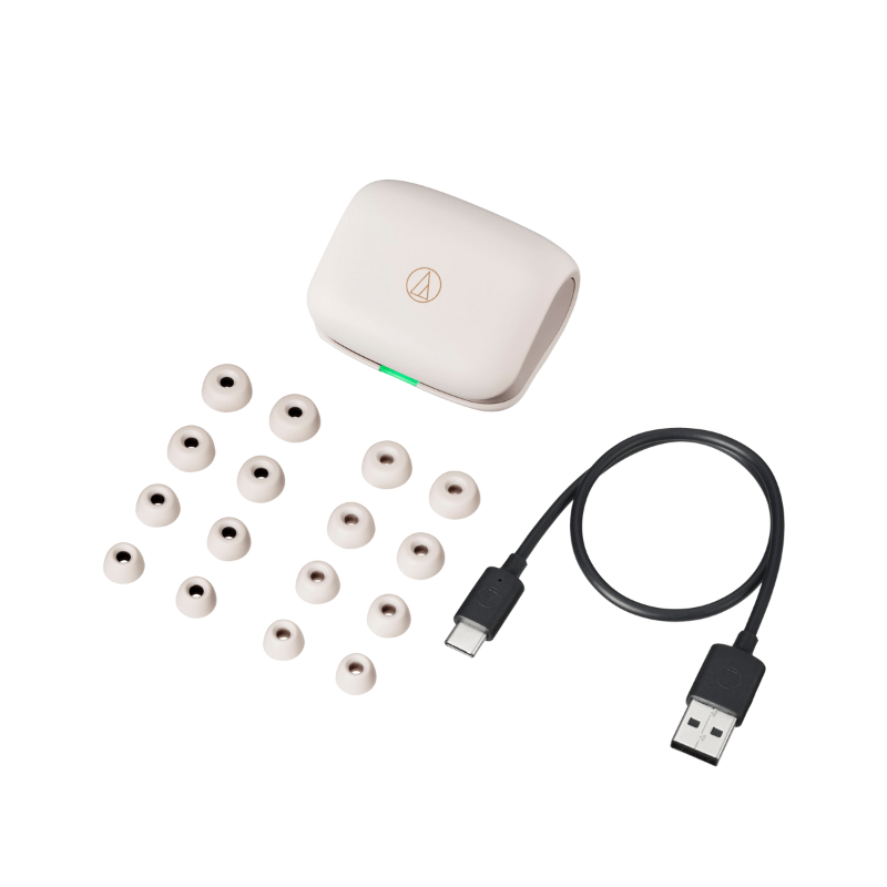 - 30cm充電用USBケーブル(USB Type-A/USB Type-C)、ソフトイヤピース(XS,S,M,L)、ノーマルイヤピース(XS,S,M,L)