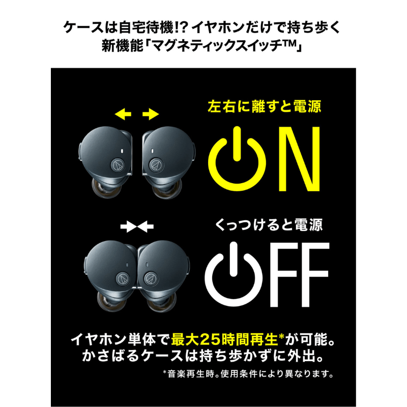 それはイヤホンを取り出して左右に離すと電源ON、マグネットでくっつけると電源OFFできる、