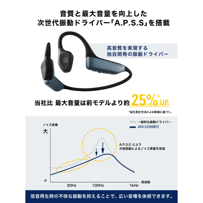 耳をふさがない世界初*の軟骨伝導ヘッドホン ATH-CC500BT の第2世代モデルです。