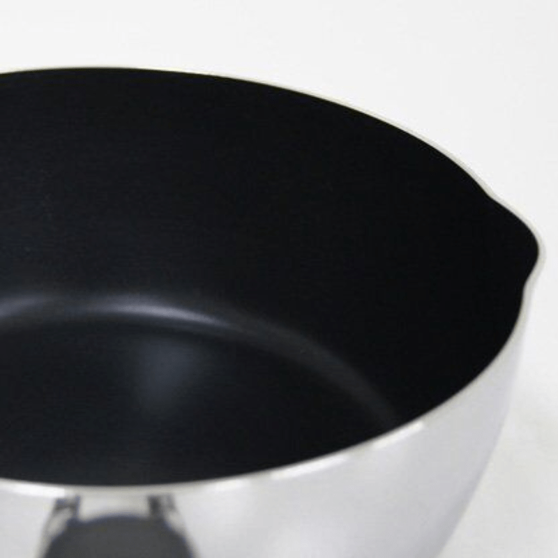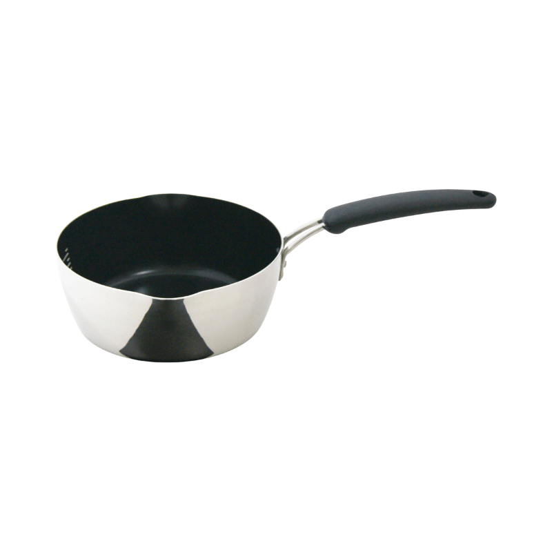 ステンレスとアルミニウムの2層構造。熱を食材に均一に伝え、おいしく仕上げます。見やすい水量目盛りと便利な注ぎ口が付いています。内面はふっ素樹脂加工でお手入れ簡単です。