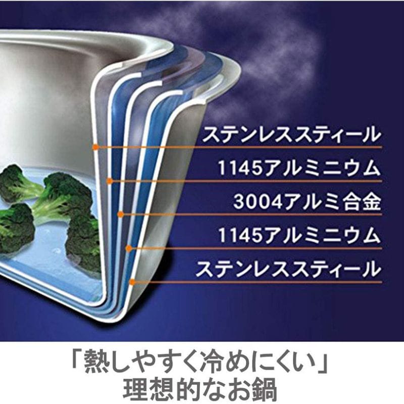 - 全面5層構造 5層材質:ステンレススティール、1145アルミニウム、3004アルミニウム合金、1145アルミニウム、ステンレススティール