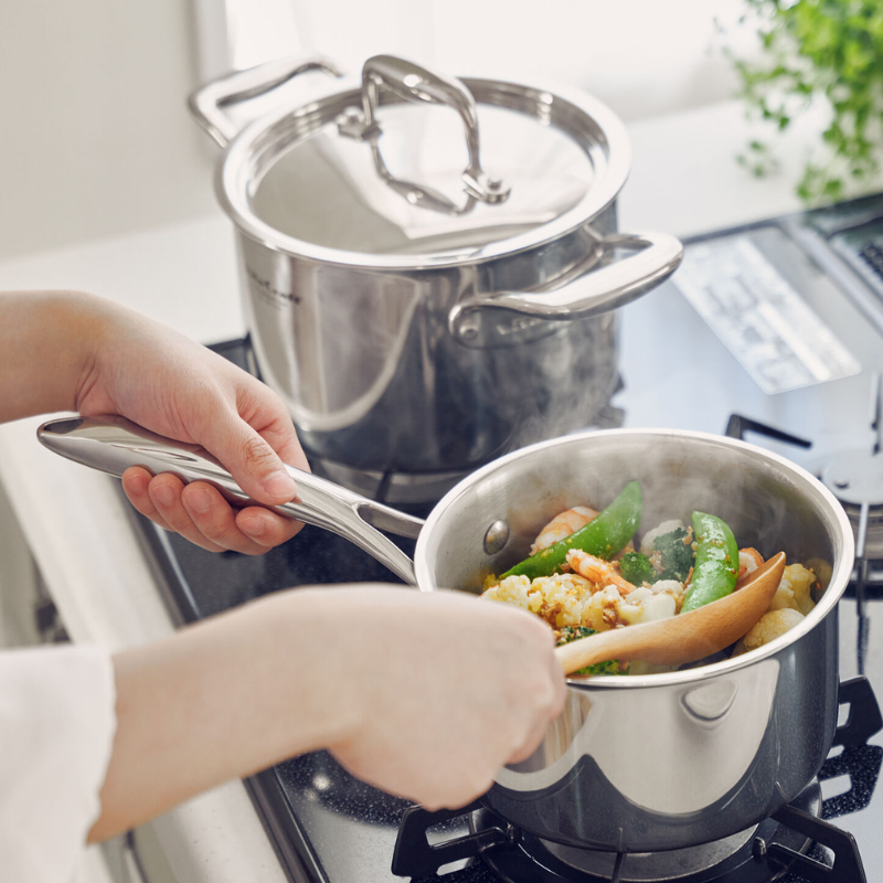 ステンレスとアルミを重ねて「熱しやすく冷めにくい」理想的な熱効率を実現しました。