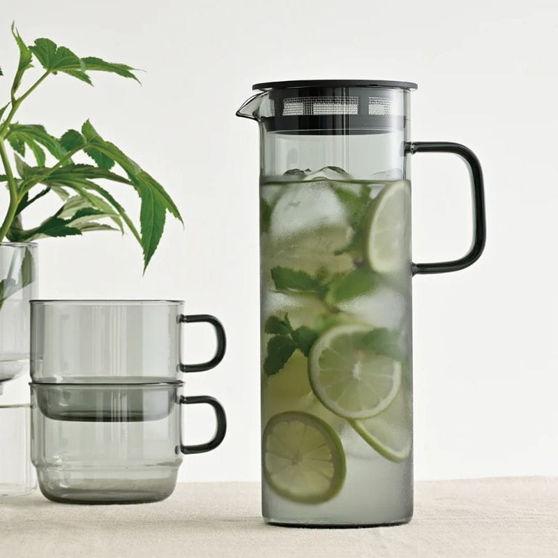 メッシュフィルター付きのフタがついたガラスピッチャー。