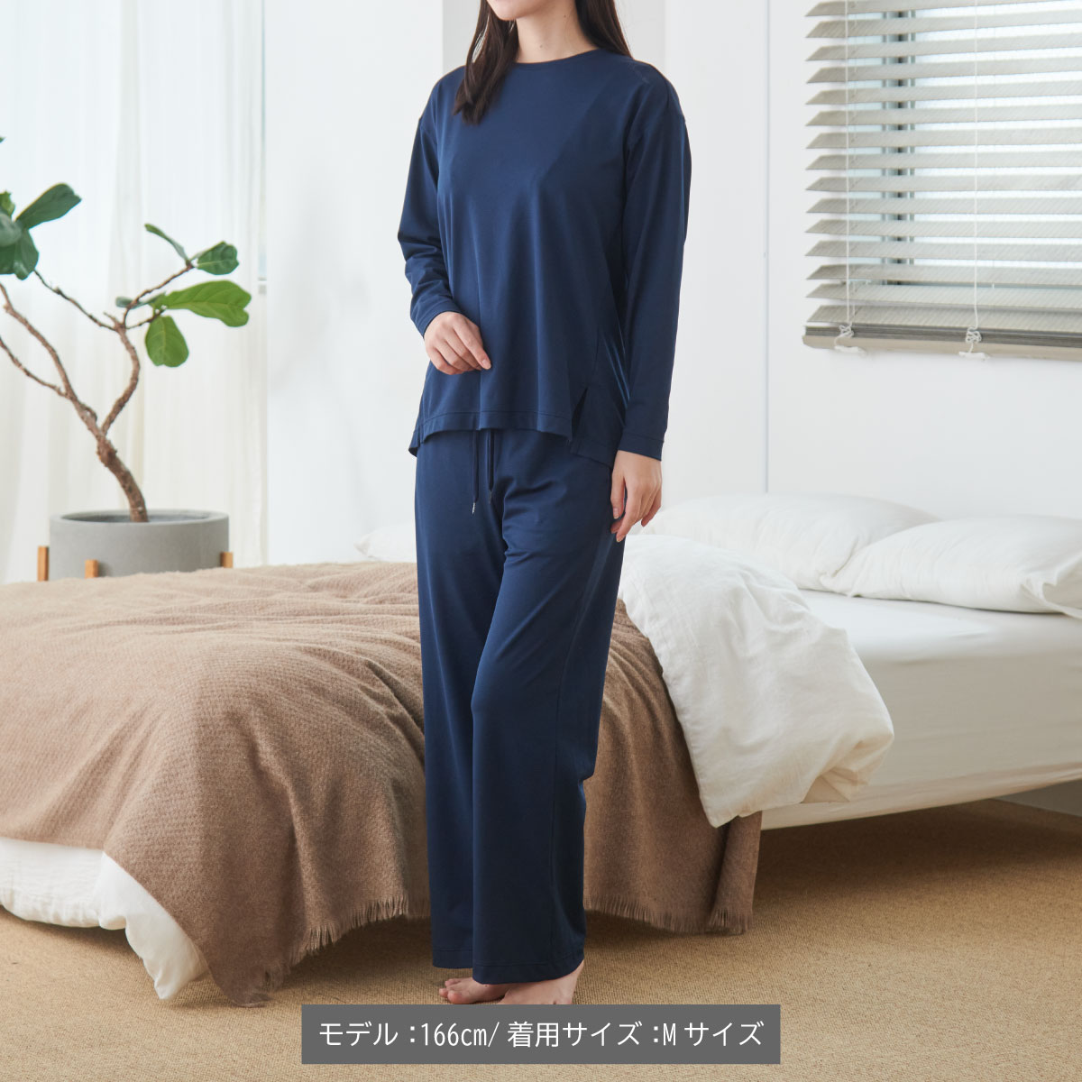 ボトムスはやや前振りのサイドシームとフレアラインで脚長・着痩せ効果を感じさせるシルエット。