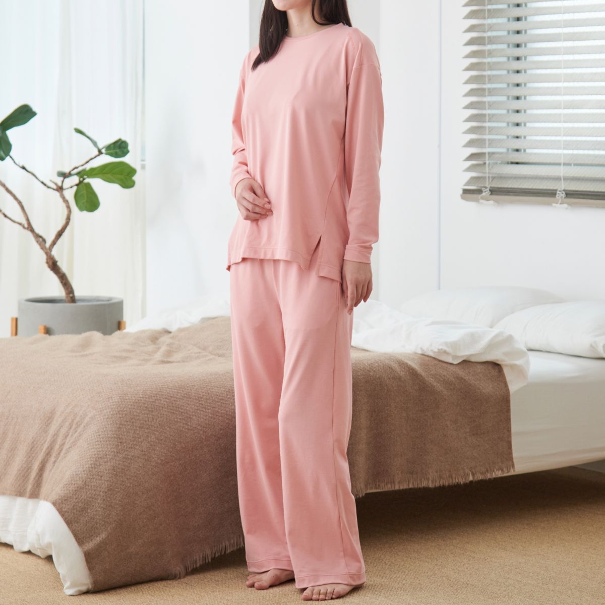 顔から首周りを美しく見せてくれるボートネックに、程よいドロップショルダーが優しい印象のゆったりトップスは、裾スリットとバックスタイルの緩やかなフレアーで体形をカバーしつつ、「リラックス感」あるデザインに。