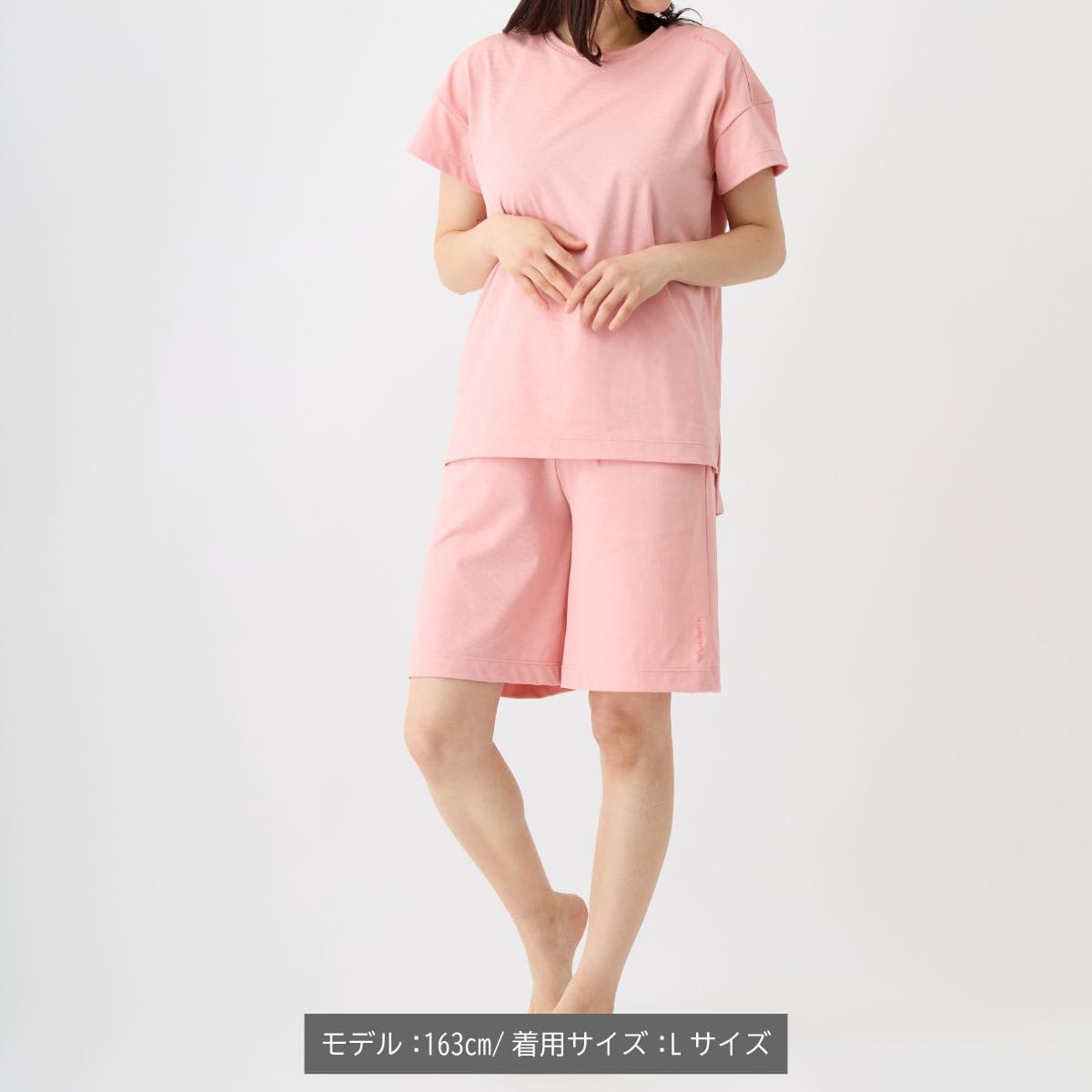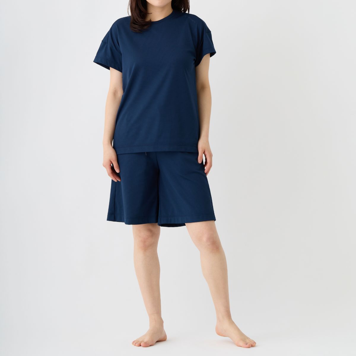 ネックラインから肩、二の腕までを美しく見せるスタイリッシュなトップスと美シルエットで軽やかな履き心地のボトムスの上下セットです。