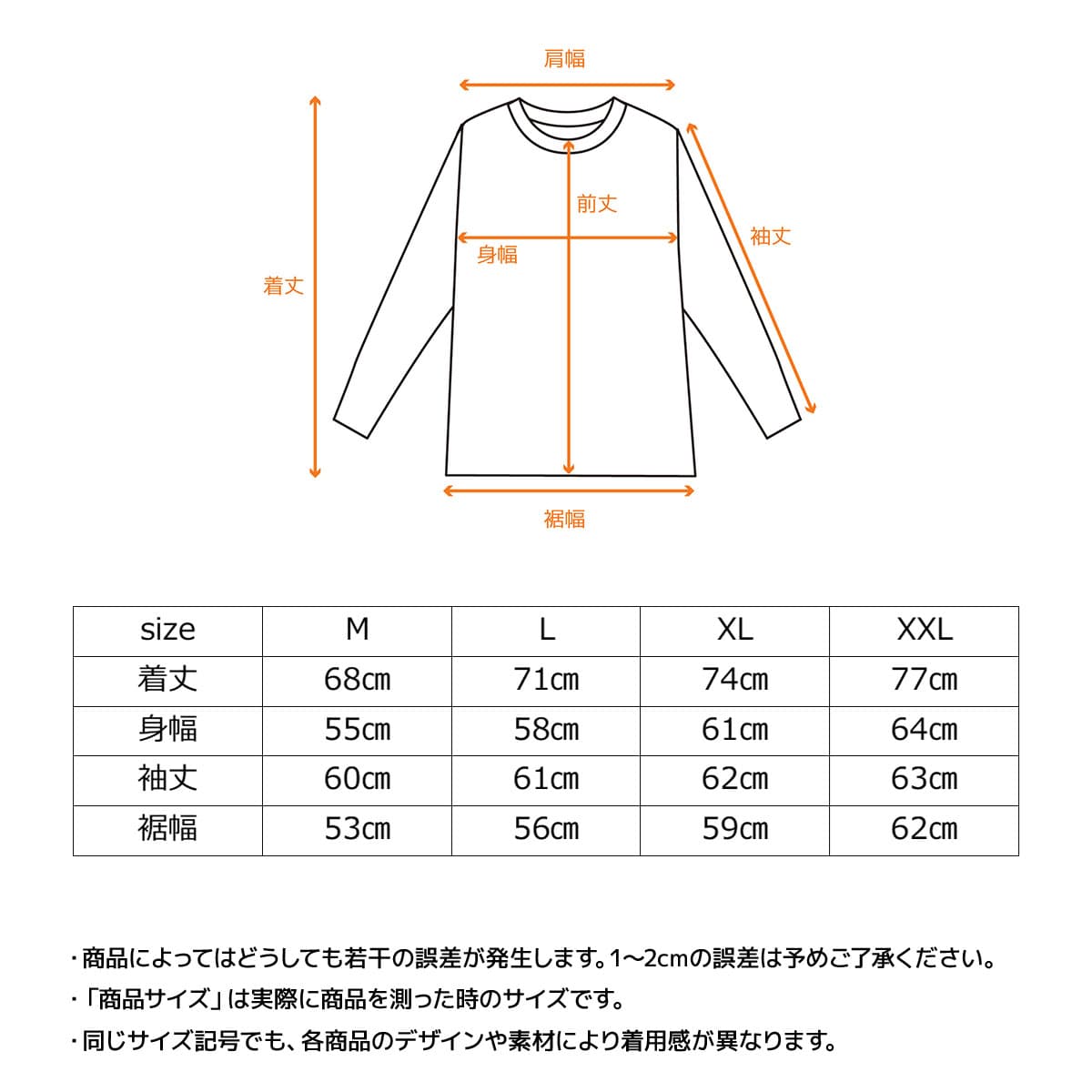 | 身幅 | 55cm | 58cm | 61cm | 64cm |