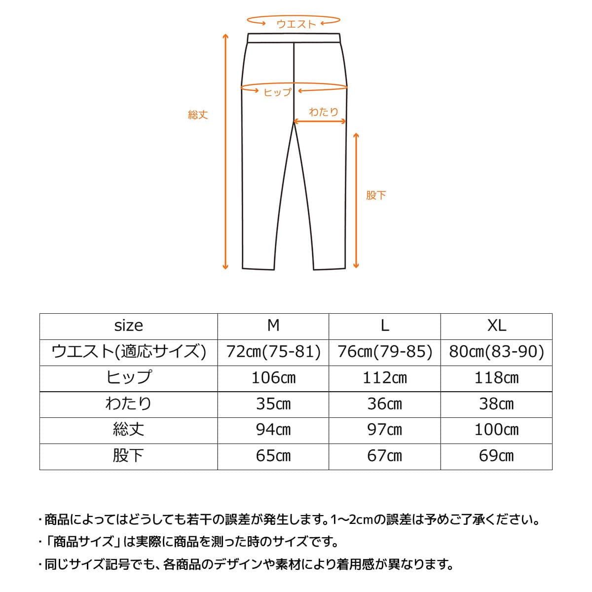 | ウエスト | 72cm | 76cm | 80cm |