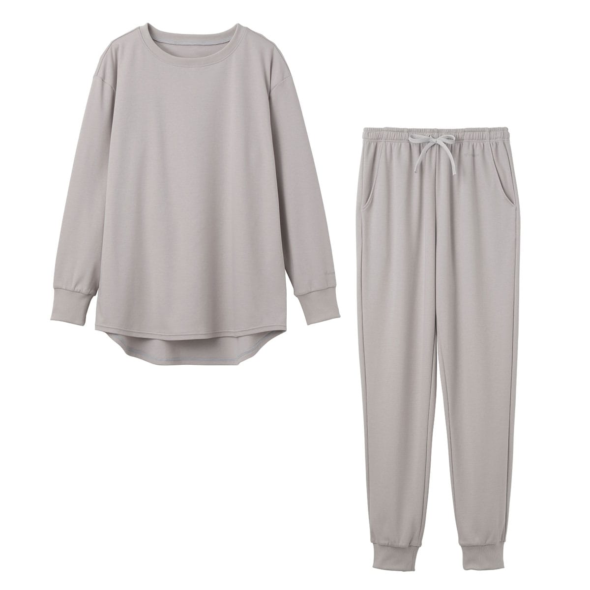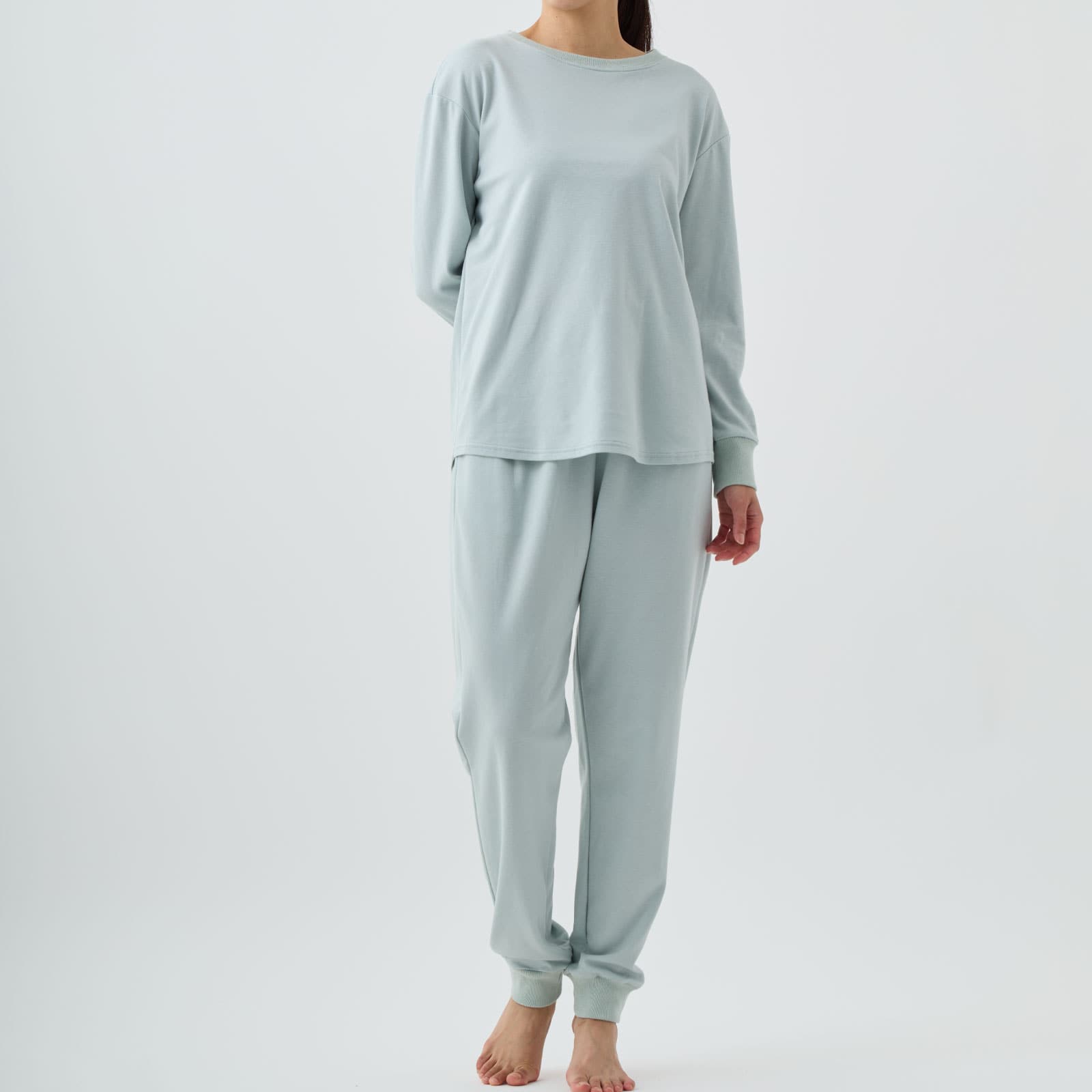 トップスはほどよいゆとりと後ろ丈が長いシャツテイルの裾で、気になる腰回りやヒップをカバー。 首回りと袖にリブを使用し、あたたかさを閉じ込めてくれます。