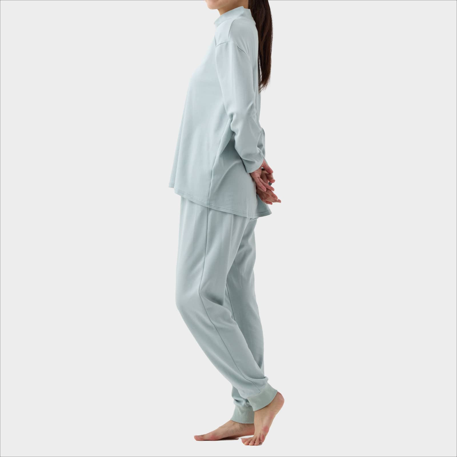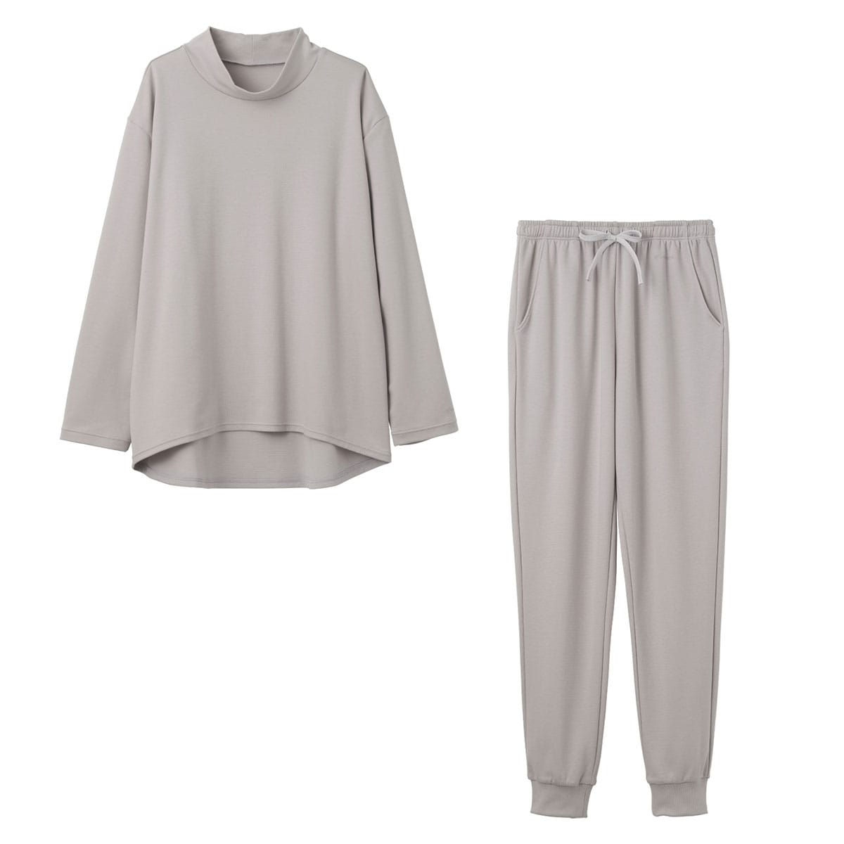 トップスはほどよいゆとりと後ろ丈が長いシャツテイルの裾で、気になるお腹まわりやヒップをカバー。 首元はハイネックであたたかく、やわらかい素材で締め付け感がないためストレスを感じません。