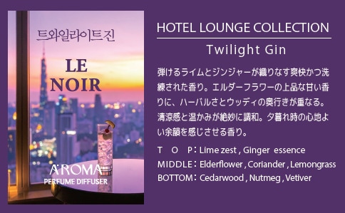 弾けるライムとジンジャーが織りなす爽快かつ洗練された香り。エルダーフラワーの上品な甘い香りに、ハーバルさとウッディの奥行きが重なる。清涼感と温かみが絶妙に調和。夕暮れ時の心地よい余韻を感じさせる香り