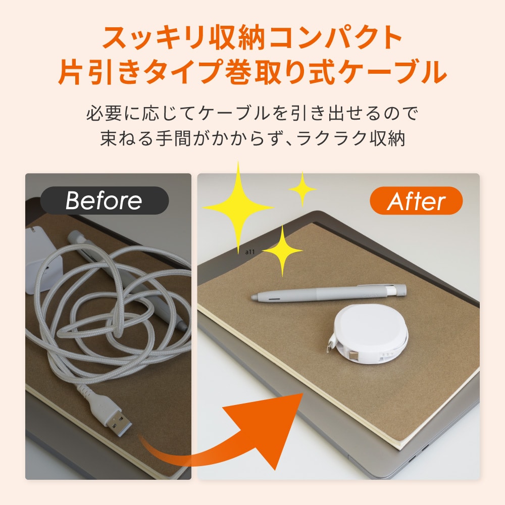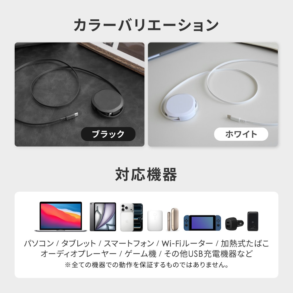 片引き巻取り式 Type-C to Type-Cケーブル 1.2m ブラック PD60W充電/データ通信対応 スタンド付き katamaki