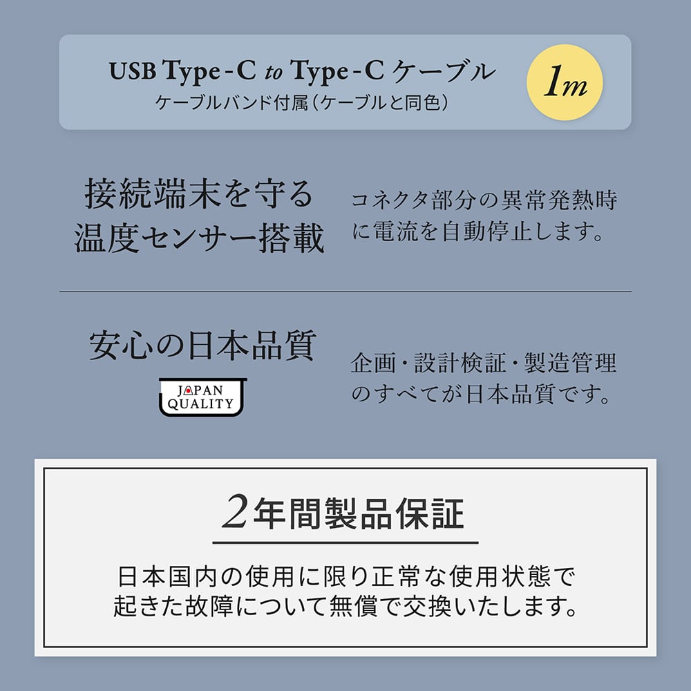 ケーブル先端に温度センサーを搭載しています。USB Type-Cプラグと相手側接続端子のコネクター接合部で異常発熱が起きると電流を止め、発熱による火災事故を未然に防ぎます