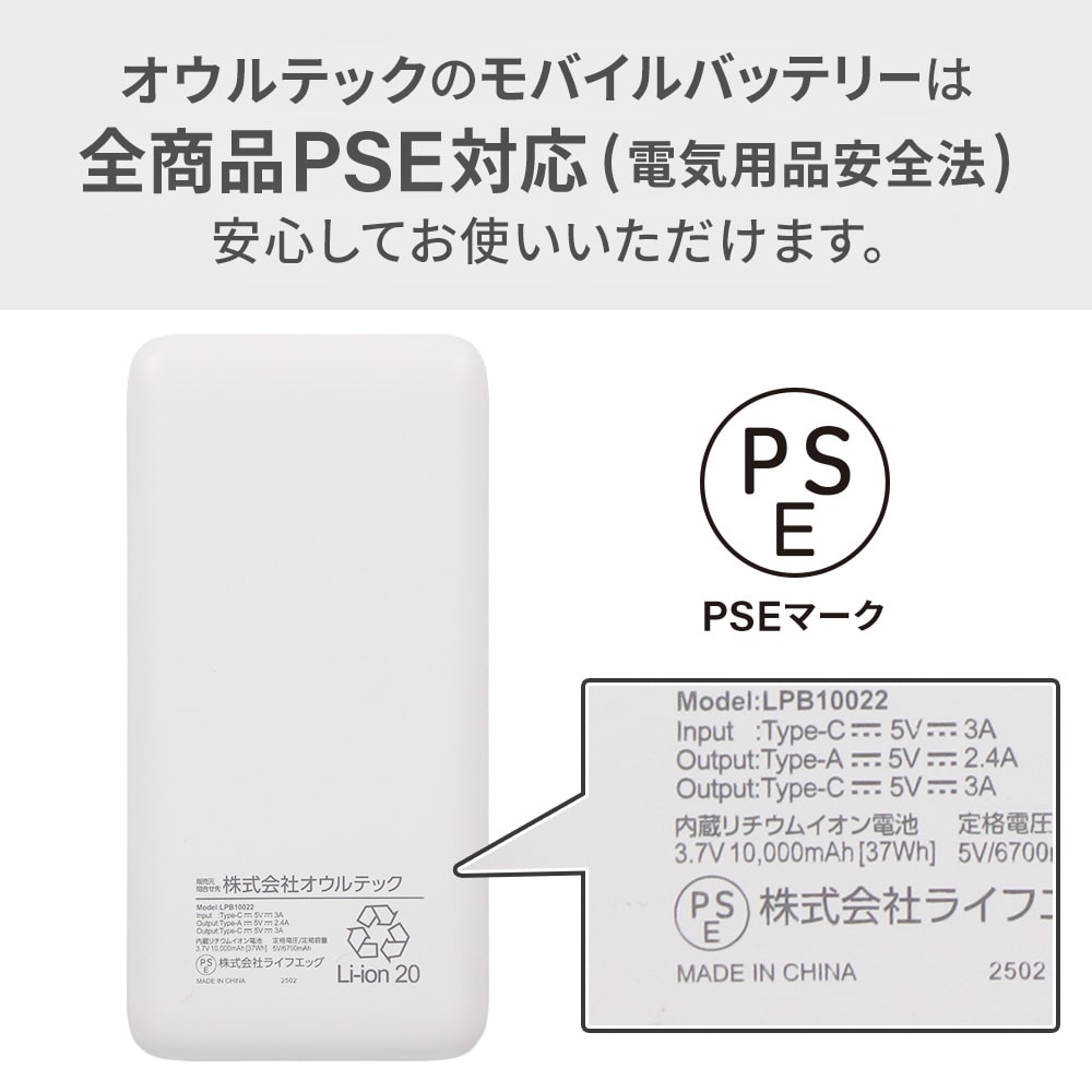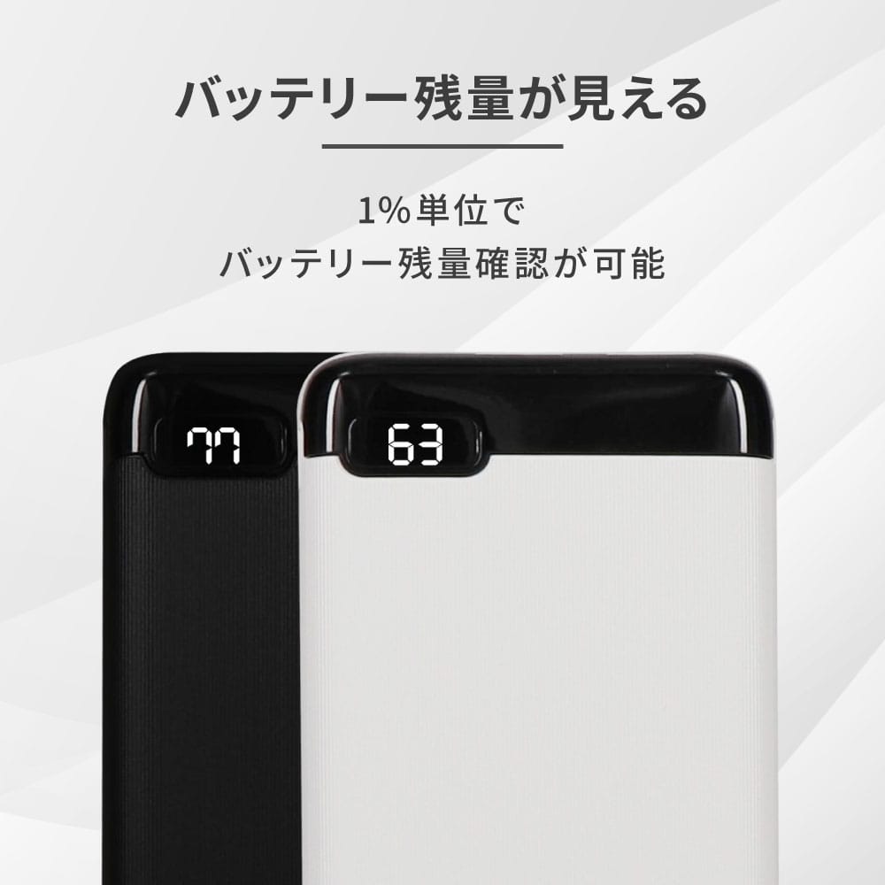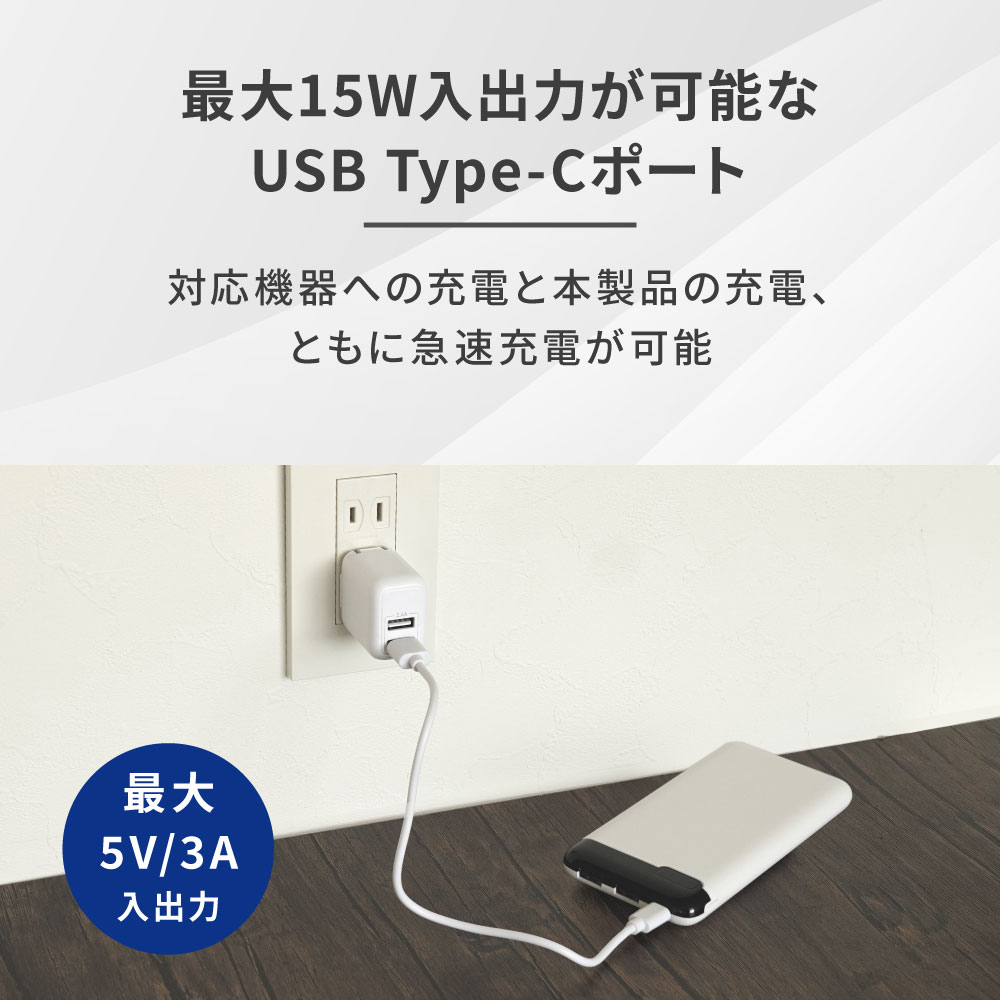 モバイルバッテリー 10000mAh 最大15W対応 ホワイト USB Type-C入出力/USB Type-A出力 PSE 認証済み バッテリー残量が数値で分かる