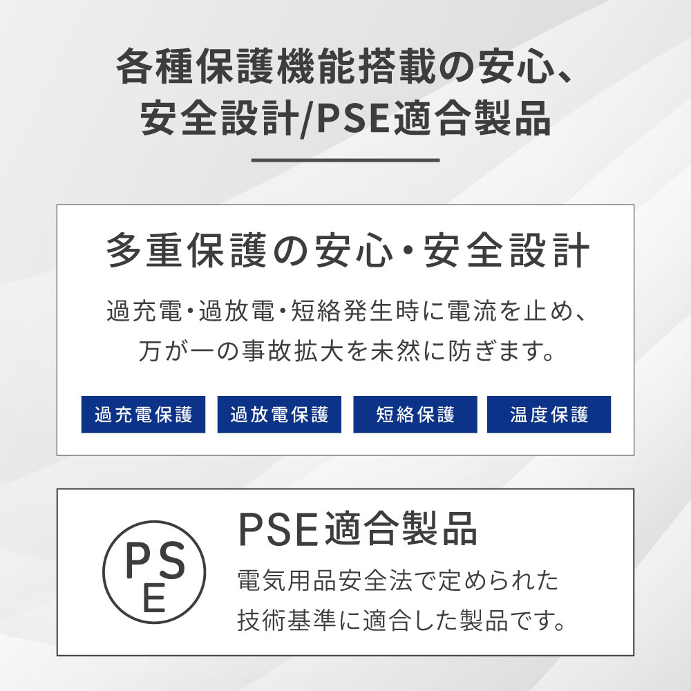 保護機能過充電(電圧 / 電流)保護、過放電(電圧 / 電流)保護、短絡(ショート)保護、温度上昇抑制