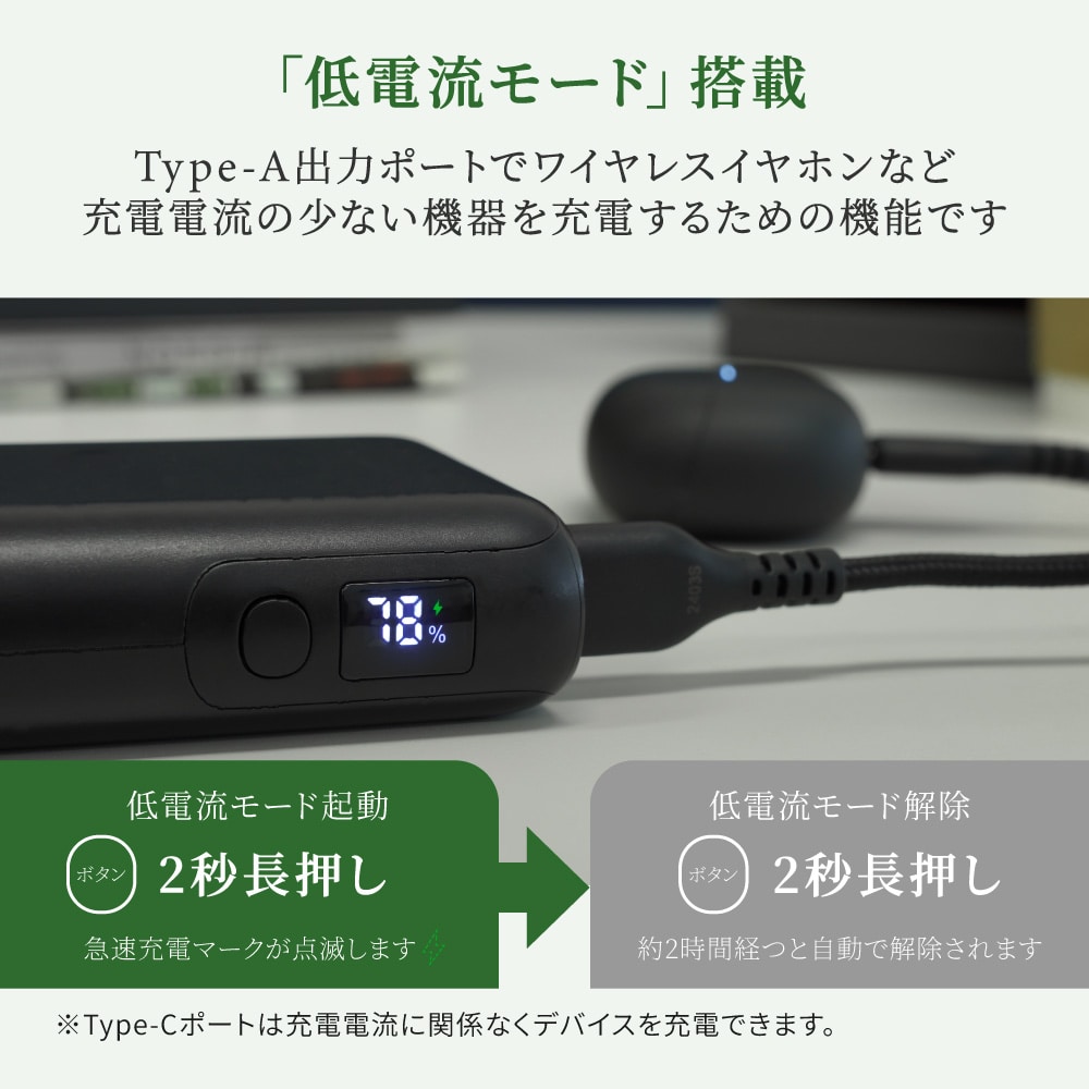 低電流モードは約2時間で通常モードに戻ります。途中でオフにしたい場合は電源ボタンを約2秒間長押ししてください。途中で電源をオフにしたい場合は、電源ボタンを素早く2回押してください。