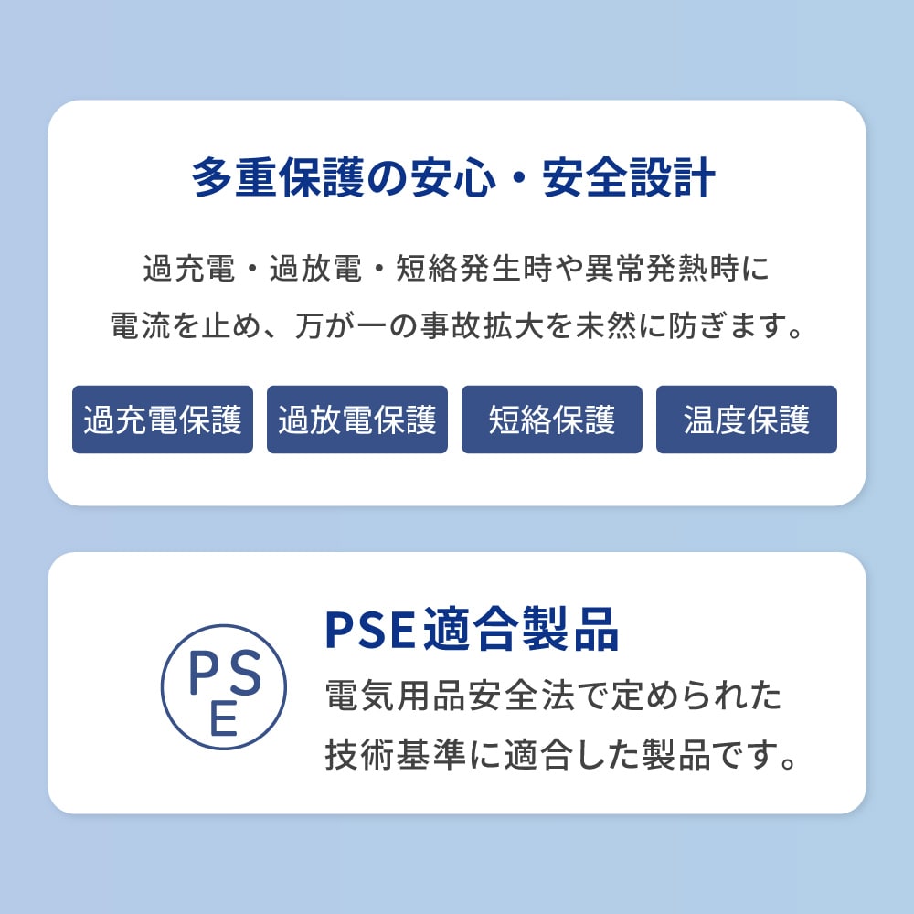 過充電(電圧/電流)保護、過放電(電圧/電流)保護、短絡(ショート)保護、温度保護