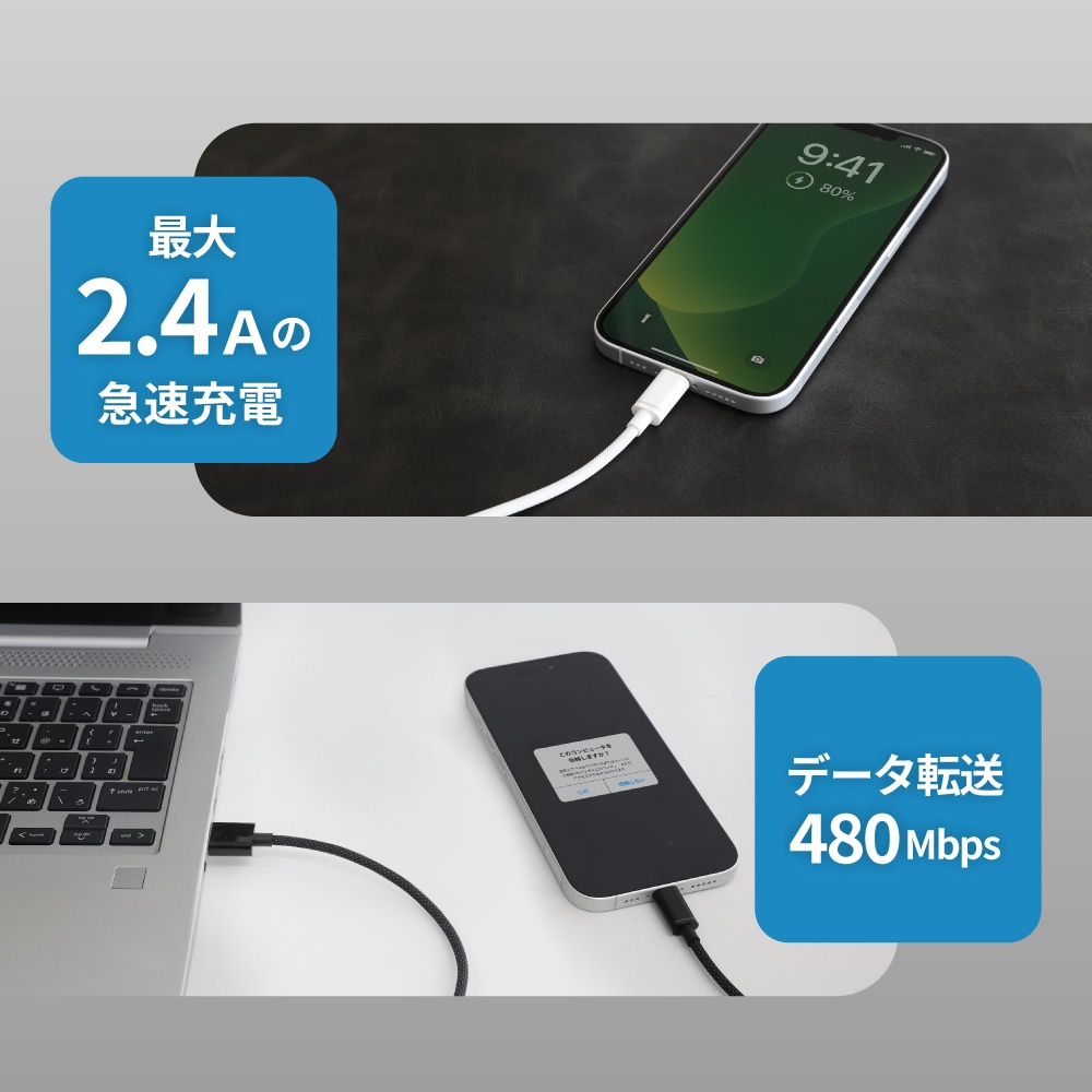 USB Type-A to Lightning ブレイデッドケーブル 70cm ホワイト 耐屈曲1万回 急速充電2.4A充電/データ転送