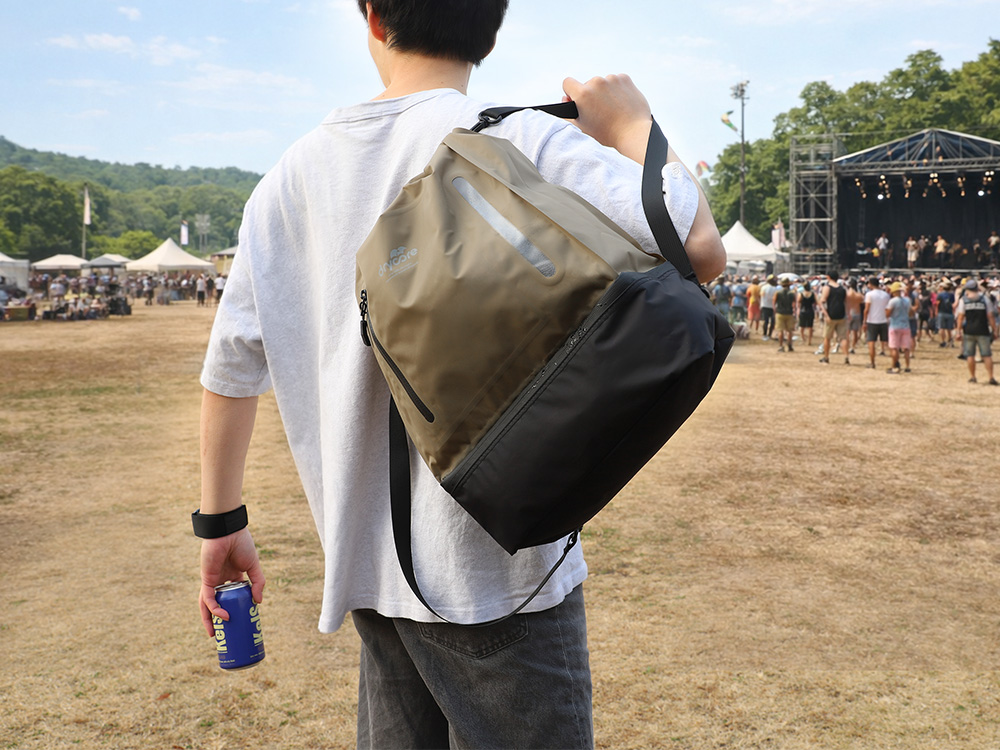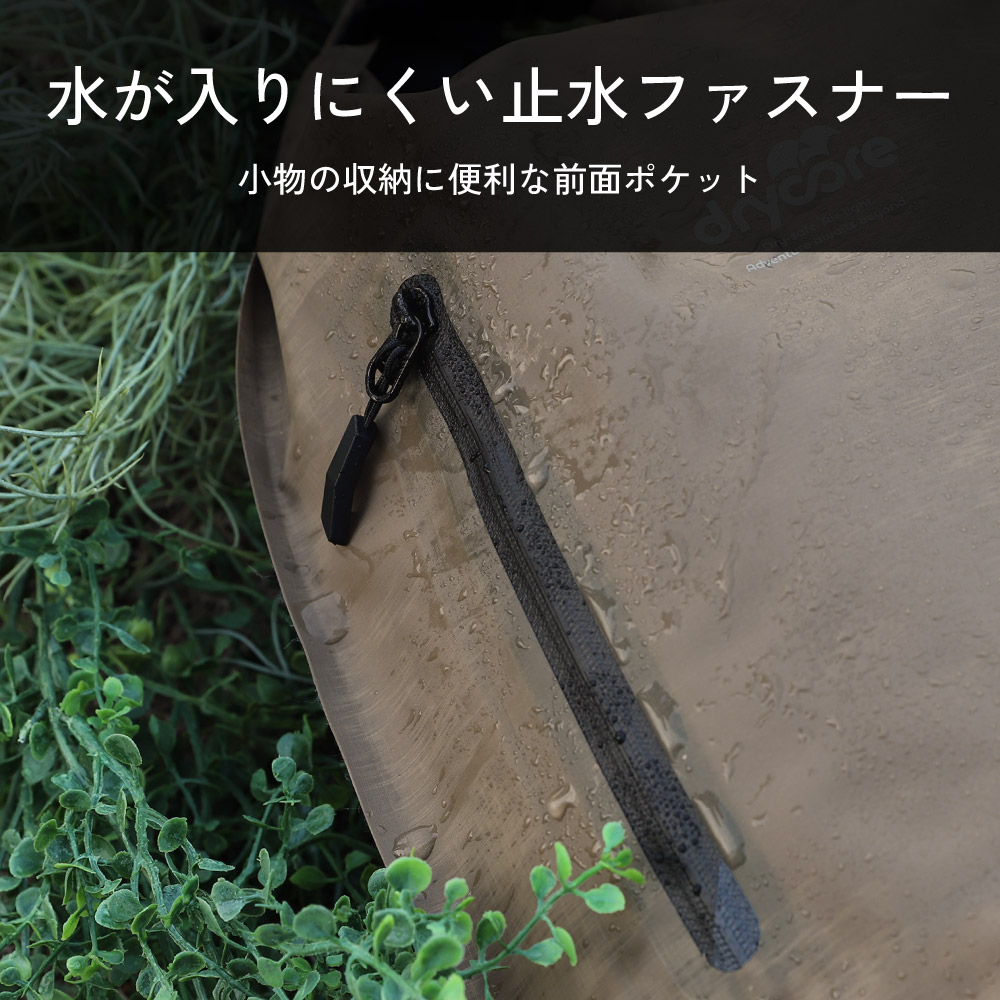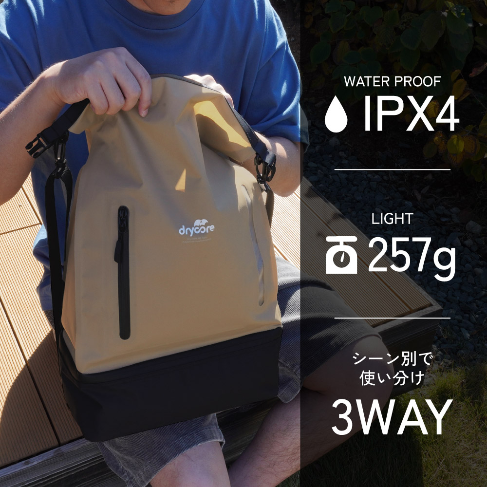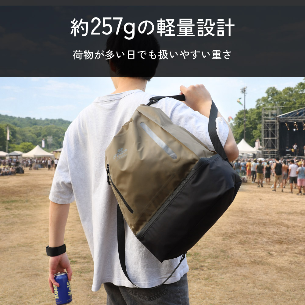3Way(手提げ/肩掛け/ナップサック)で使える 防水ドライバッグ カーキ 15L 2ルーム IPX4準拠