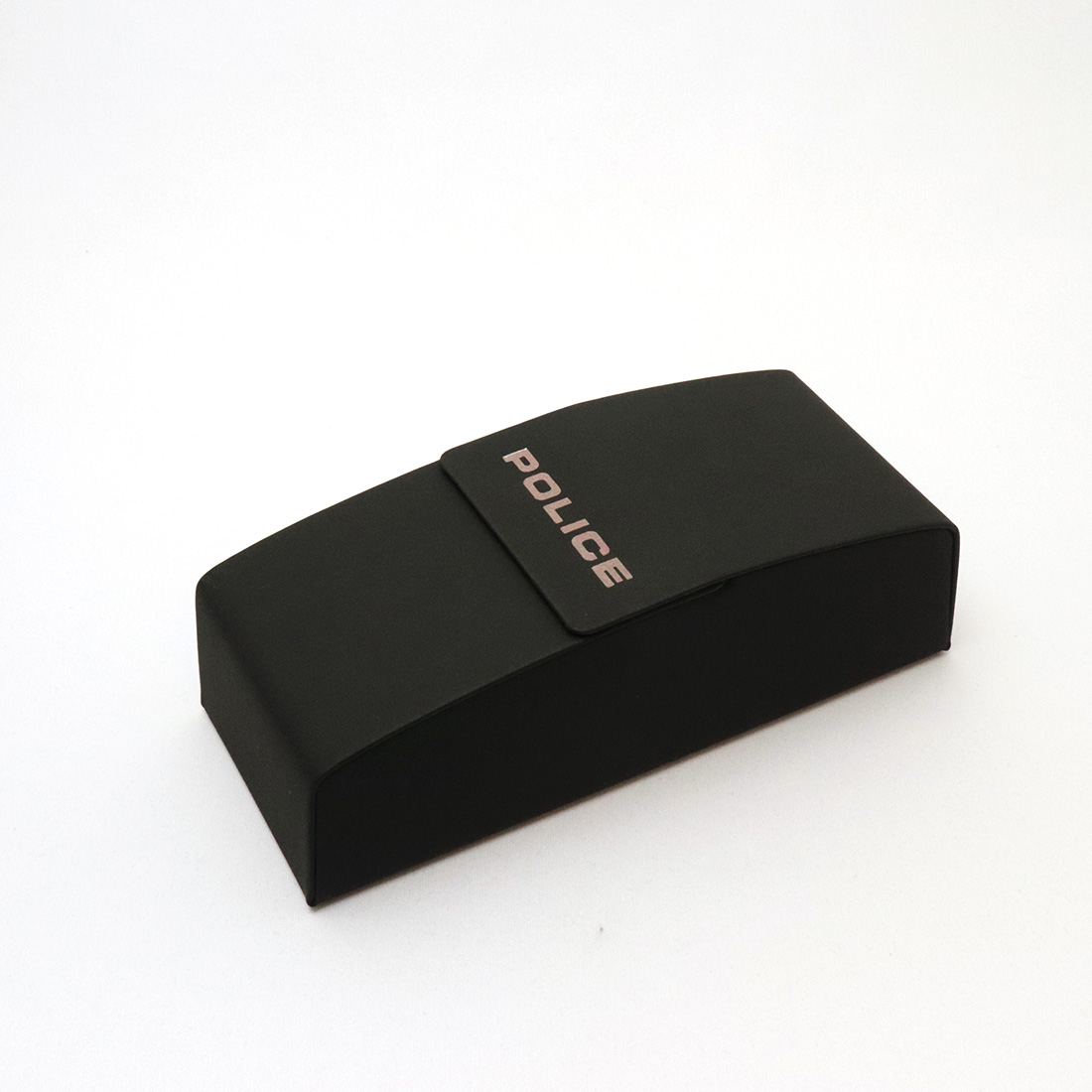 フロントにはメタルリッジ、サンドテンプルにはPOLICEの「P」ウイングロゴが入り、テンプルチップのメタルモチーフも含めてステータスを演出します。