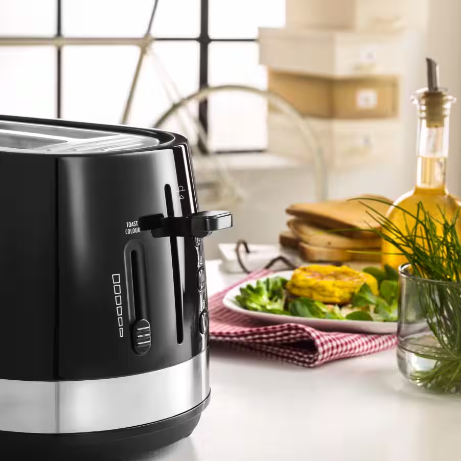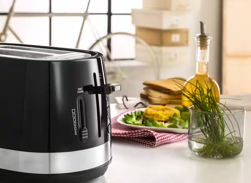 光沢のあるプラスチックボディーと、それを囲う大胆なステンレスリング。コントラストそのものが美しく、シンプルながら、他にはないデザインを実現したアクティブシリーズのポップアップトースター。外はこんがり、中はふわふわの美味しいトーストが焼けます。