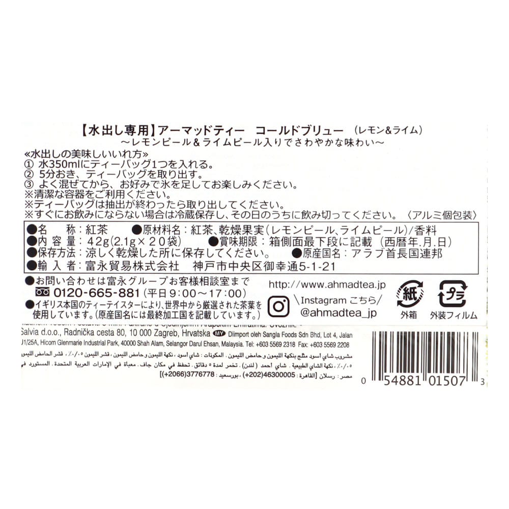水出し5分でお手軽にアイスティーをお楽しみいただけます。レモンピール&ライムピール入りでさわやかな味わいです。