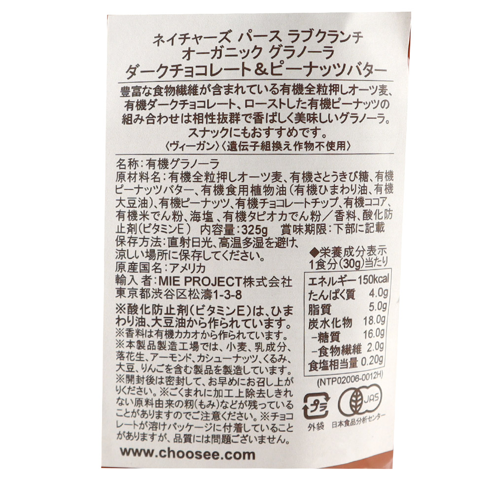 有機全粒押しオーツ麦、有機ダークチョコレート、ローストした有機ピーナッツの組み合わせ