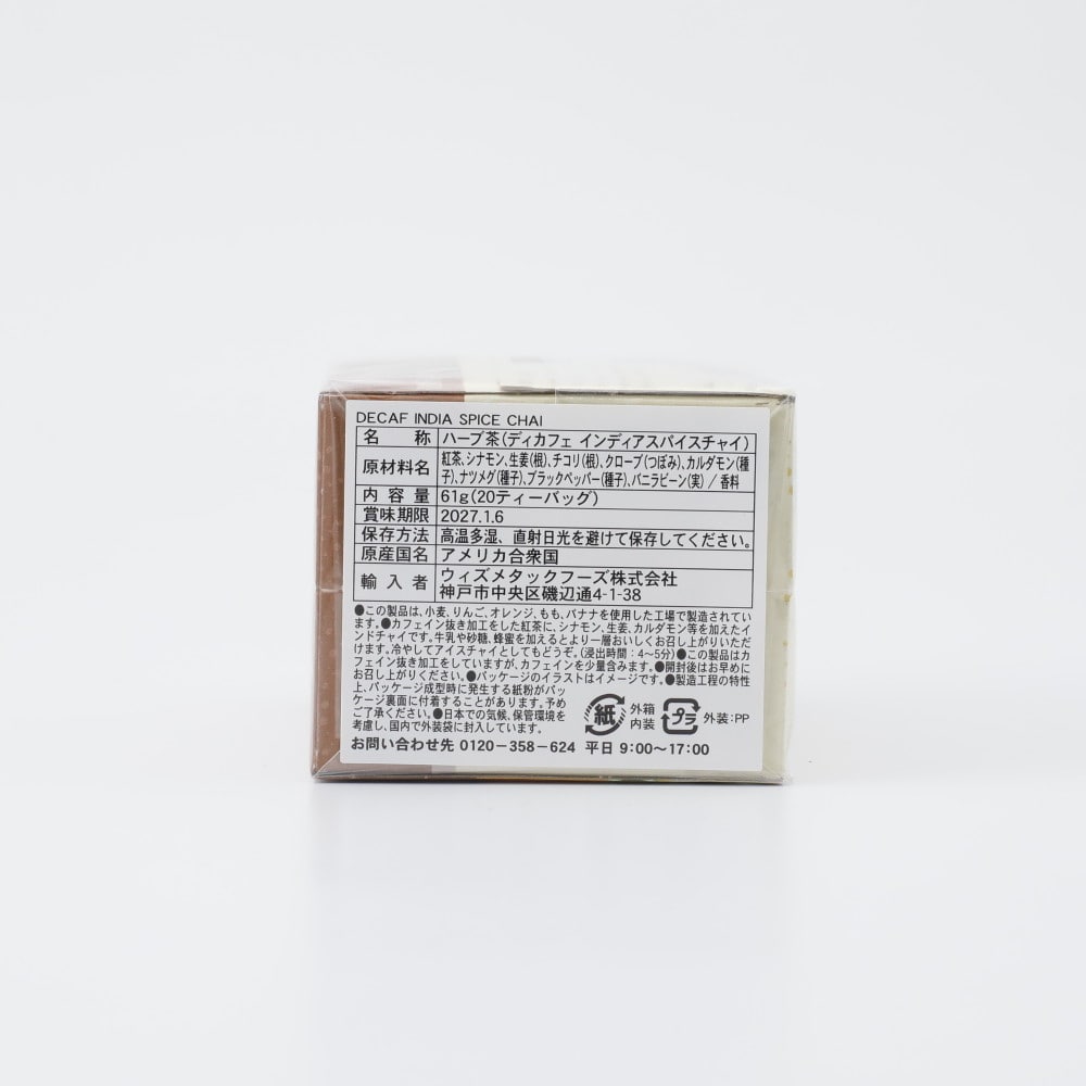 デカフェ紅茶にシナモン、生姜、カルダモンなどを加えたインドチャイです。牛乳や砂糖、またはハチミツを加えてミルクティーにしてどうぞ。