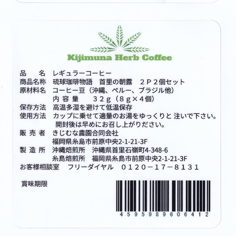 | 商品内容 | きじむなファーム 琉球珈琲物語 首里の朝露 2包入スタンドバッグ 2個セット |