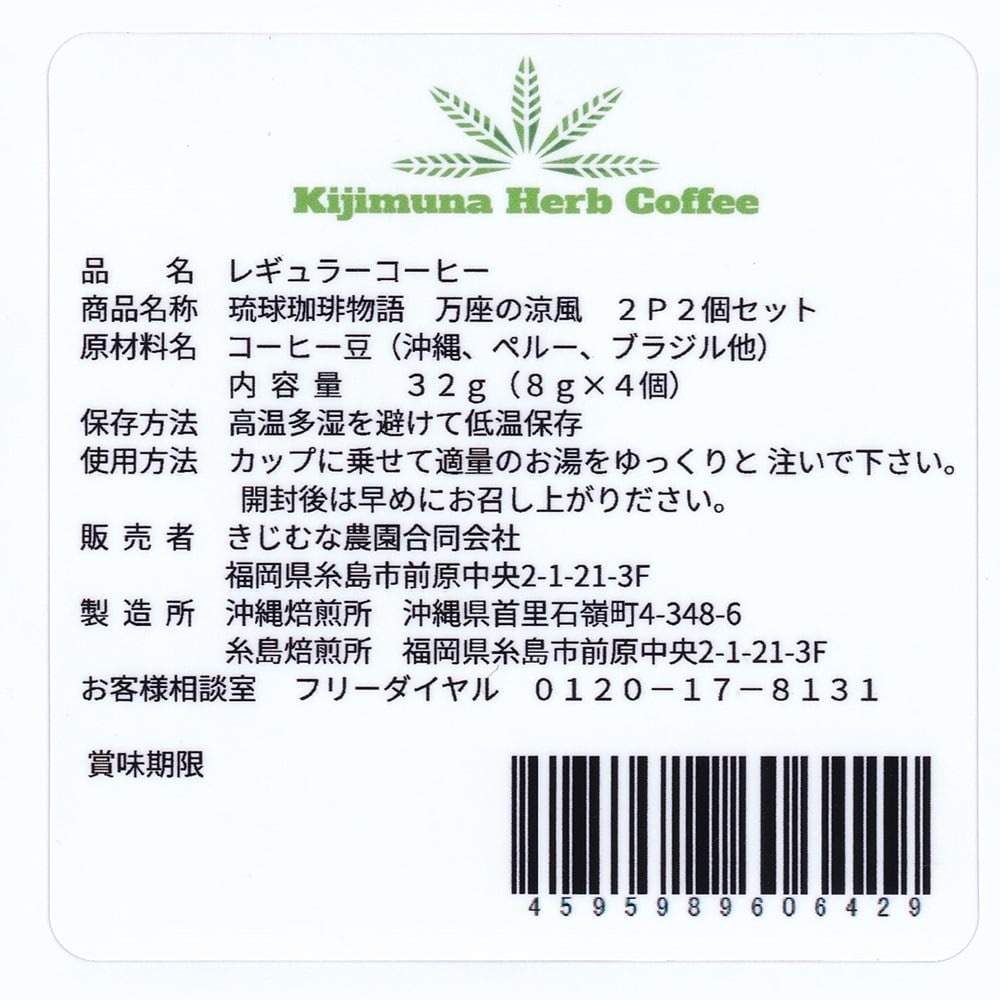 | 商品内容 | きじむなファーム 琉球珈琲物語 万座の涼風 2包入スタンドバッグ 2個セット |