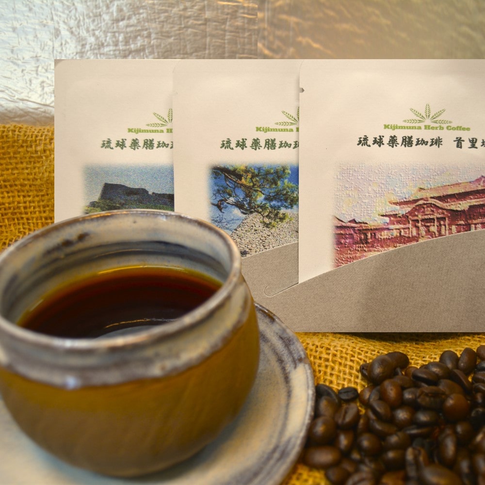 沖縄産コーヒー豆をブレンドして焙煎したコーヒーに、沖縄産の月桃とヨモギをメインにカラギ・桑・グァバ葉をブレンドしました。