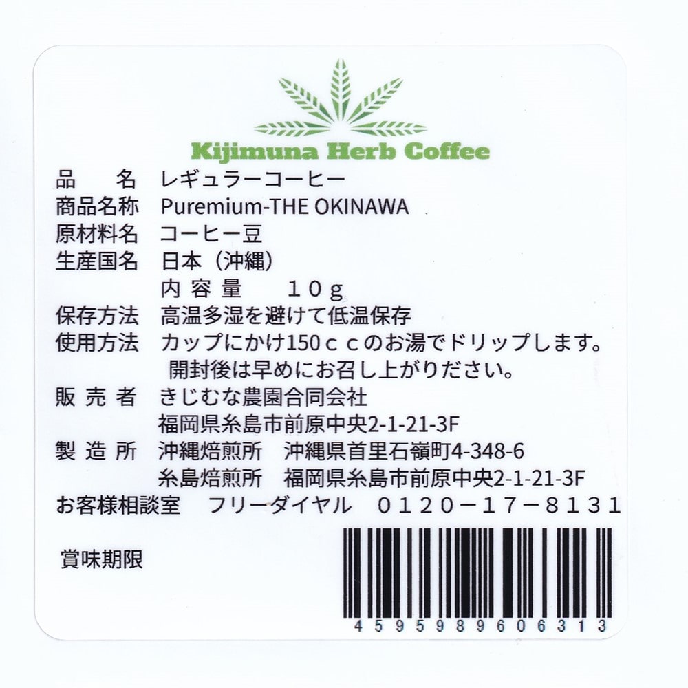 | 商品内容 | きじむなファーム 100% 沖縄産コーヒーPremium The OKINAWAドリップバッグ個包装 10g |