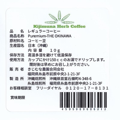 | 商品内容 | きじむなファーム 100% 沖縄産コーヒーPremium The OKINAWAドリップバッグ個包装 10g |