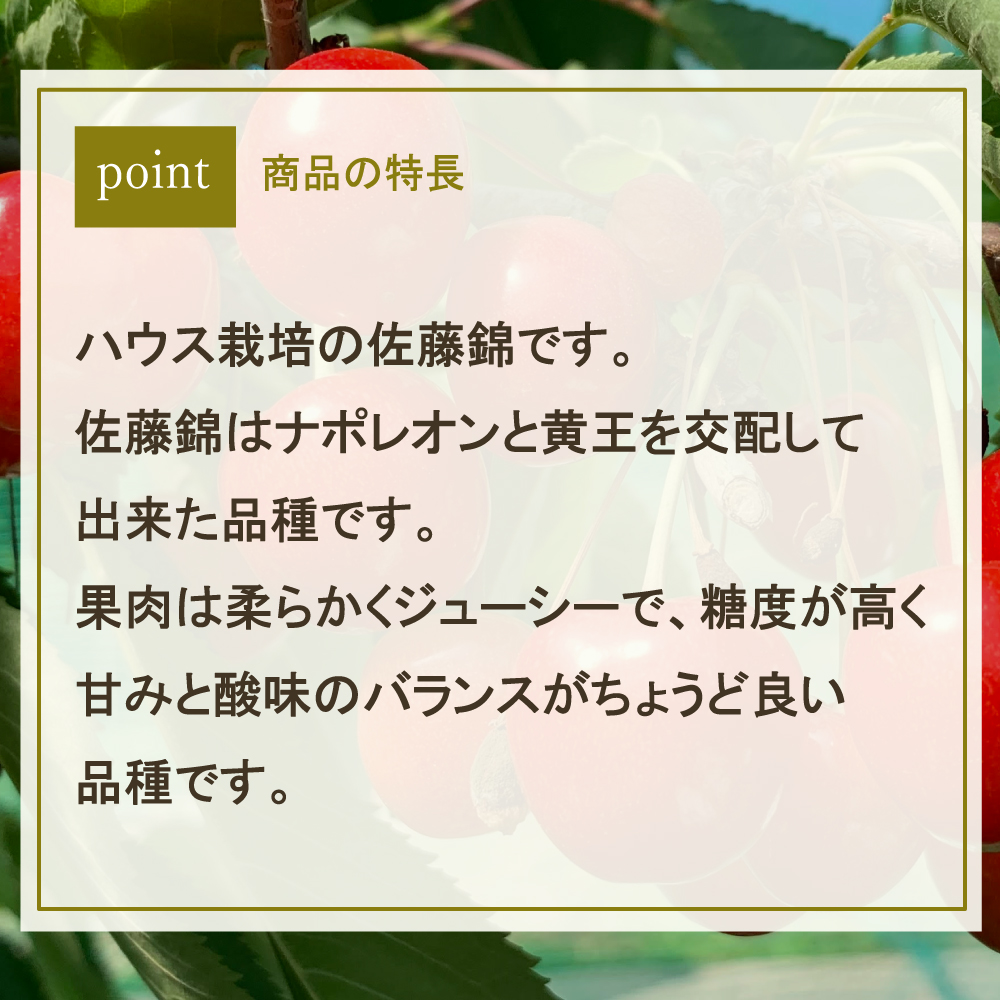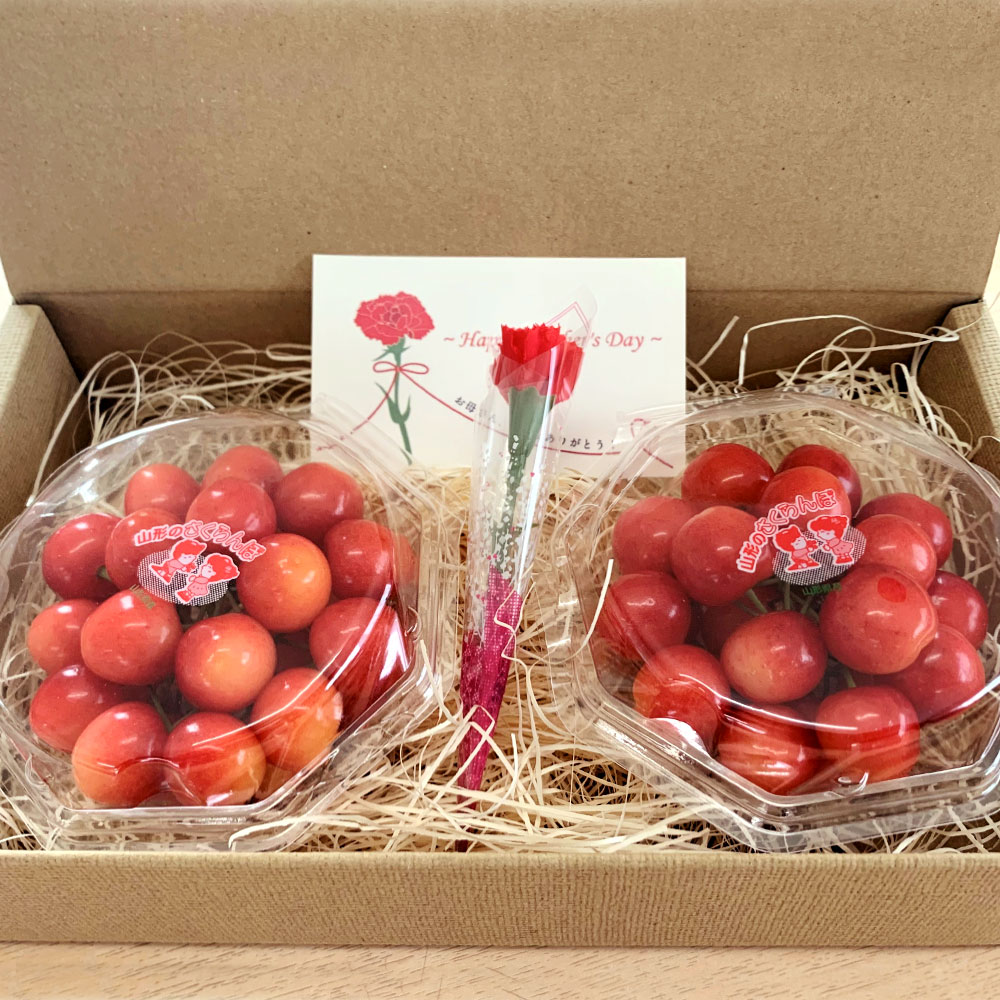 | セット内容 | 山形県産 でいたらぼファーム ハウス佐藤錦 秀・優品 100gダイヤパック×2 ● 母の日カード・カーネーション造花付き |
