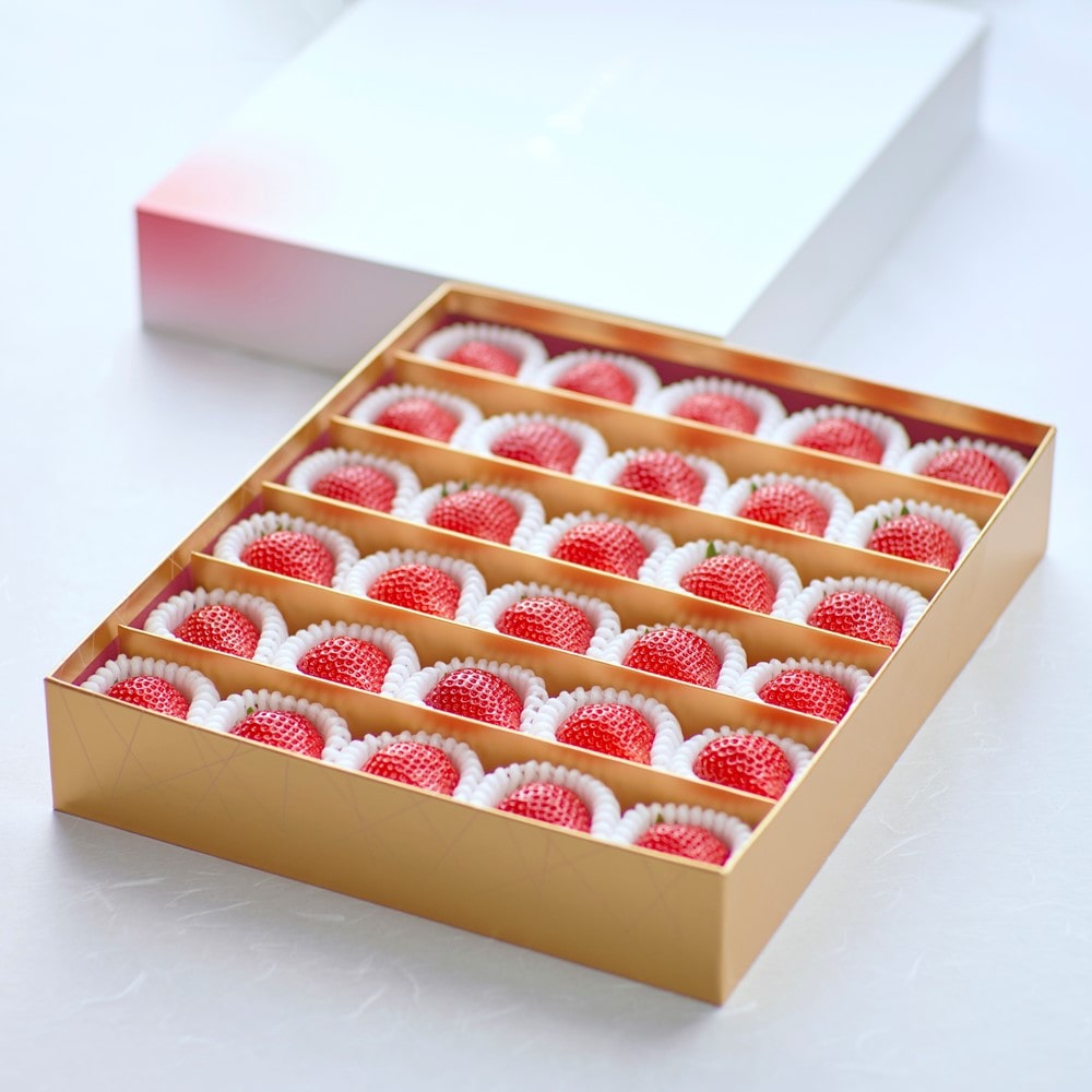 大きめの粒をずらりと並べ、おもてなしの気持ちが伝わる華麗パッケージ。「べにたま」は全国いちご選手権で受賞した<埼玉県オリジナル品種>です。