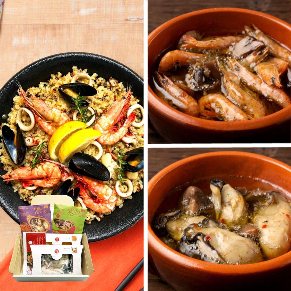 ご自宅で簡単に作れるパエリアとアヒージョのセットです。アヒージョは電子レンジで、パエリアはフライパンで。簡単作り方のレシピ付き。