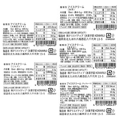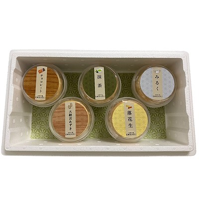 | 商品内容 | ・アイス大福もなか(ミルク)1個 ・アイス大福もなか(抹茶)1個 ・アイス大福もなか(大納言小豆)1個 ・アイス大福もなか(落花生)1個 ・アイス大福もなか(チョコレート)1個 |