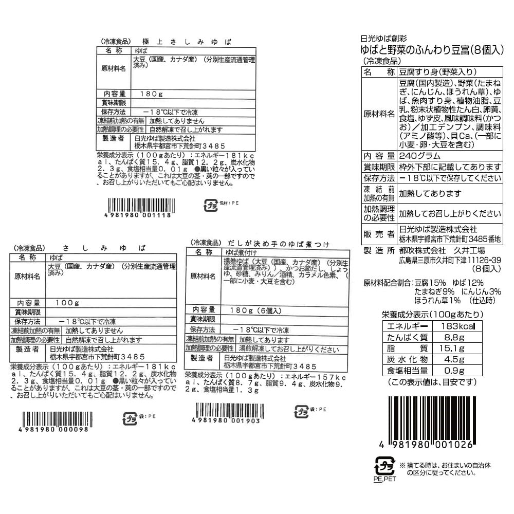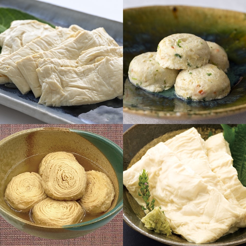 | 商品内容 | ・極上おさしみ用ゆば ×1 ・おさしみ用ゆば ×1 ・だしが決め手のゆば煮付け ×1 ・ゆばと野菜のふんわり豆腐8個入り ×1 |