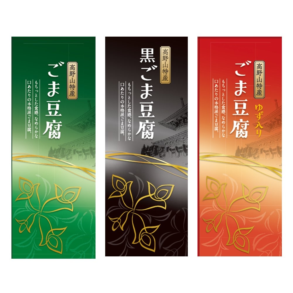 高野山伝統製法でなめらかに仕上げた白ごま豆腐、ゆずペーストを使用したさわやかなゆず風味のごま豆腐、極細引きしキメ細やかな舌触りに仕上げた黒ごま豆腐のバラエティーセットです。