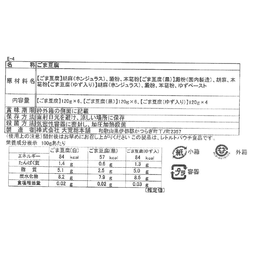 | 商品内容 | ごま豆腐×6個 黒ごま豆腐×6個 ゆず入ごま豆腐×4個 |