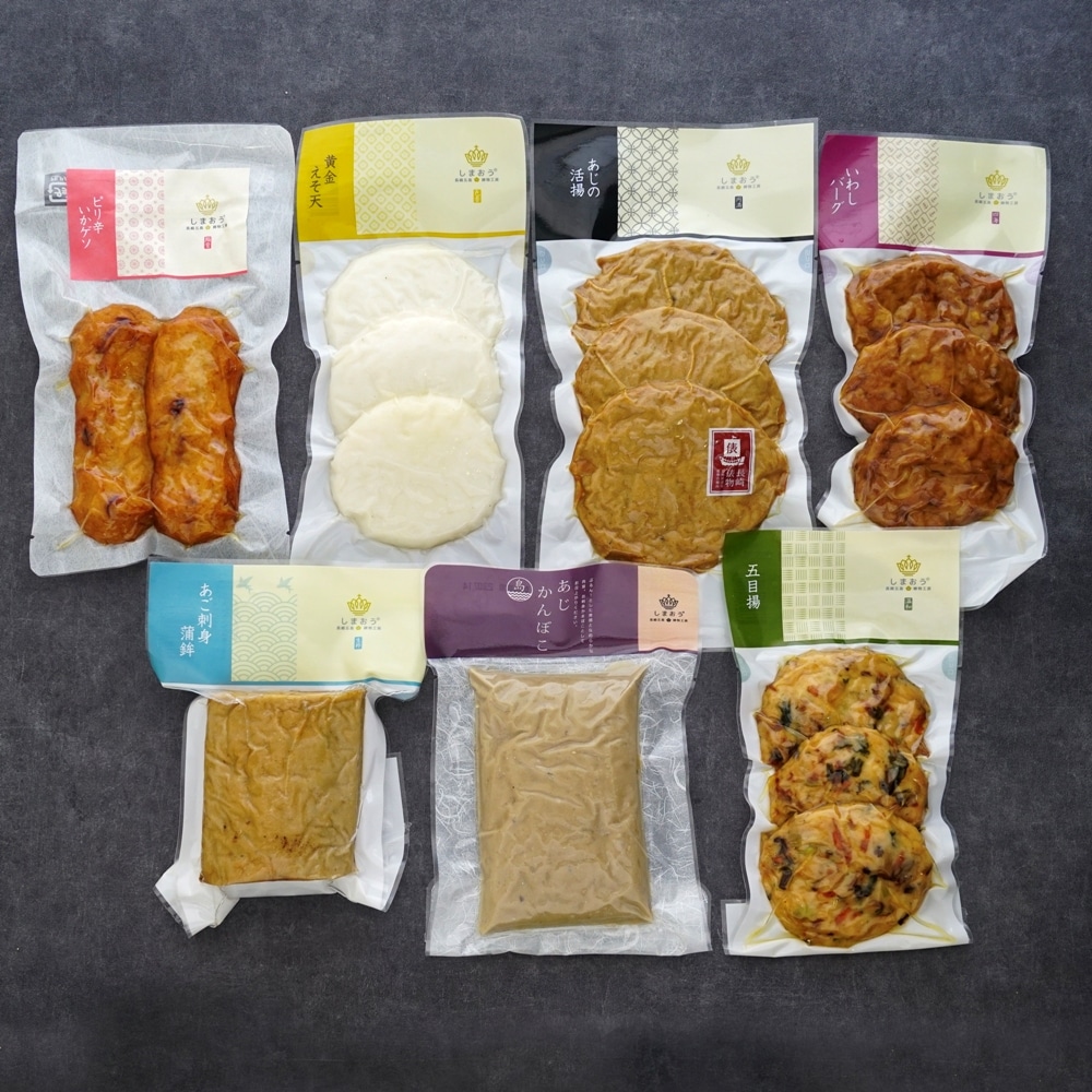 | 商品内容 | しまおう 風土 7点セット 島あじかんぼこ、五目揚、ピリ辛いかゲソ、あご刺身蒲鉾、黄金えそ天、いわしバーグ、あじの活揚 |