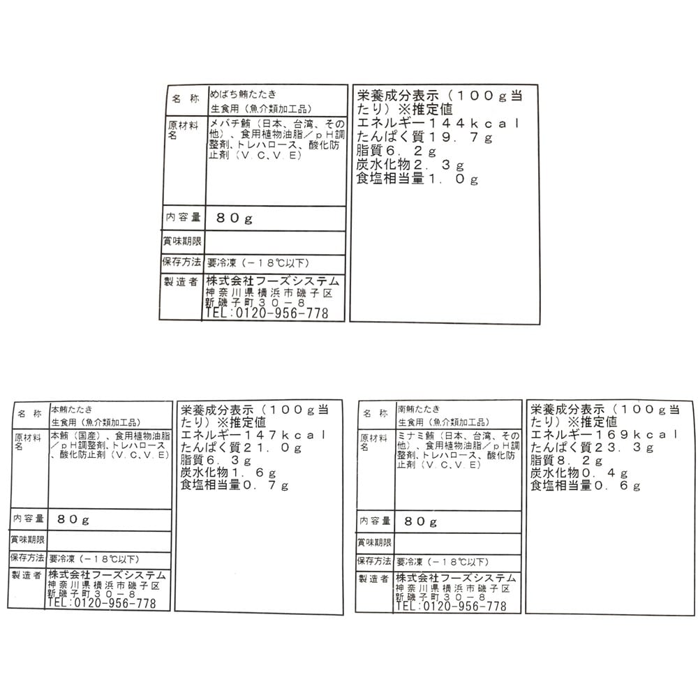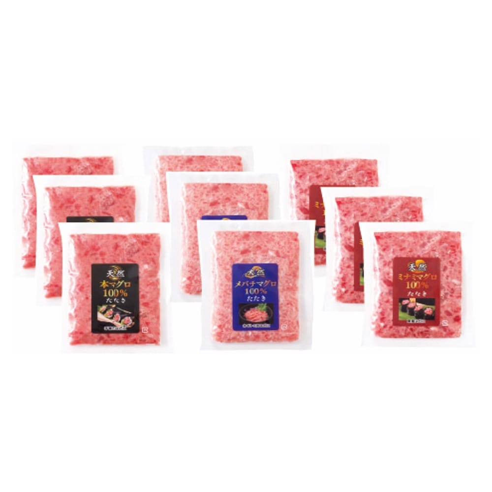 3種の天然まぐろのたたきを詰合せました。本まぐろ、南まぐろ、めばちまぐろの魚種の違いが味わえます。
