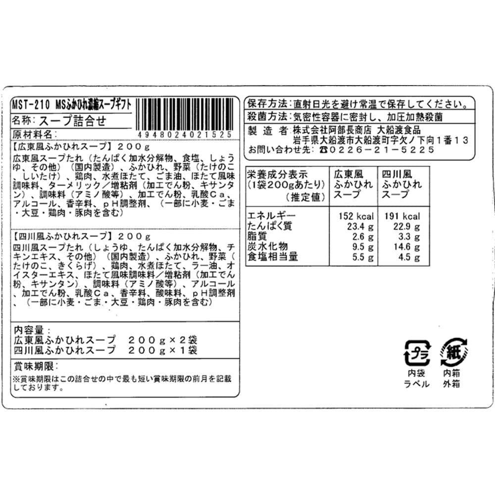 | 商品内容 | ・広東風ふかひれスープ×2個 ・四川風ふかひれスープ×1個 |