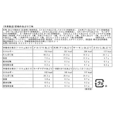 | 商品内容 | ・めかじきあぶり×1柵 ・サーモンあぶり×1柵 ・びんちょうまぐろあぶり×1柵 ・キハダマグロあぶり1柵 ・一本釣りかつおあぶり×1柵 ・天然ぶりあぶり×1柵 ・サワラあぶり×1柵 | |