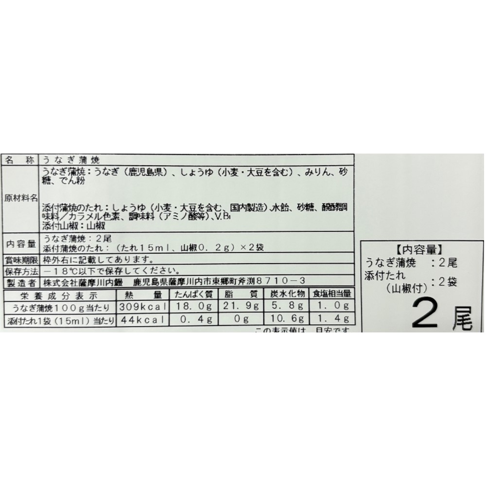 | 商品内容 | 鹿児島県産うなぎ蒲焼 136g×2尾 |