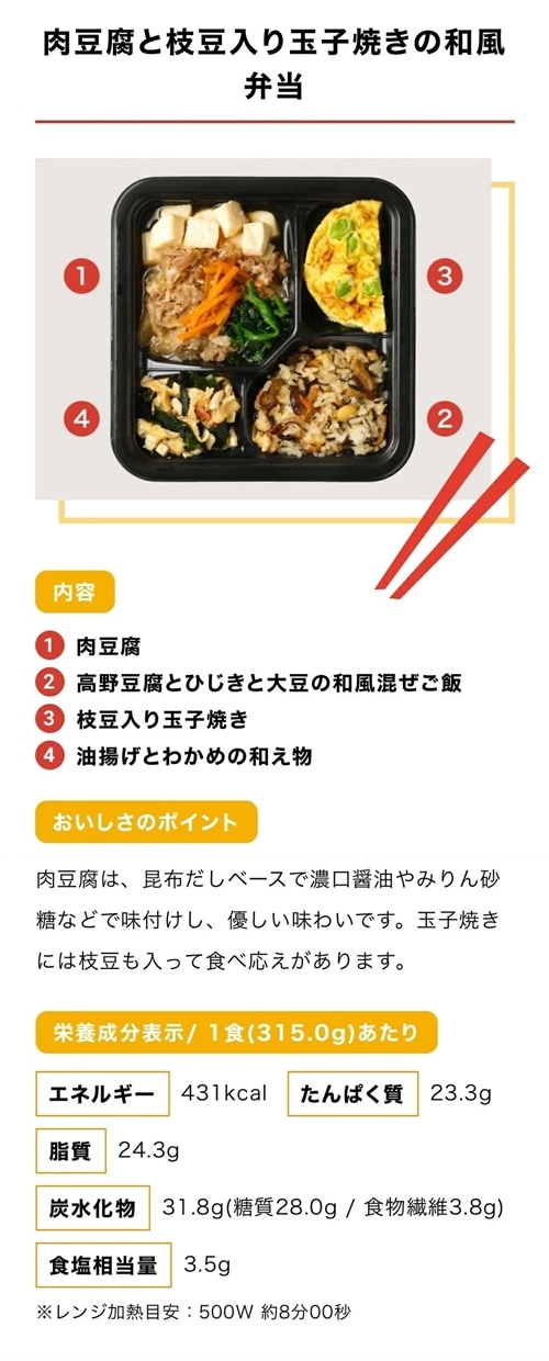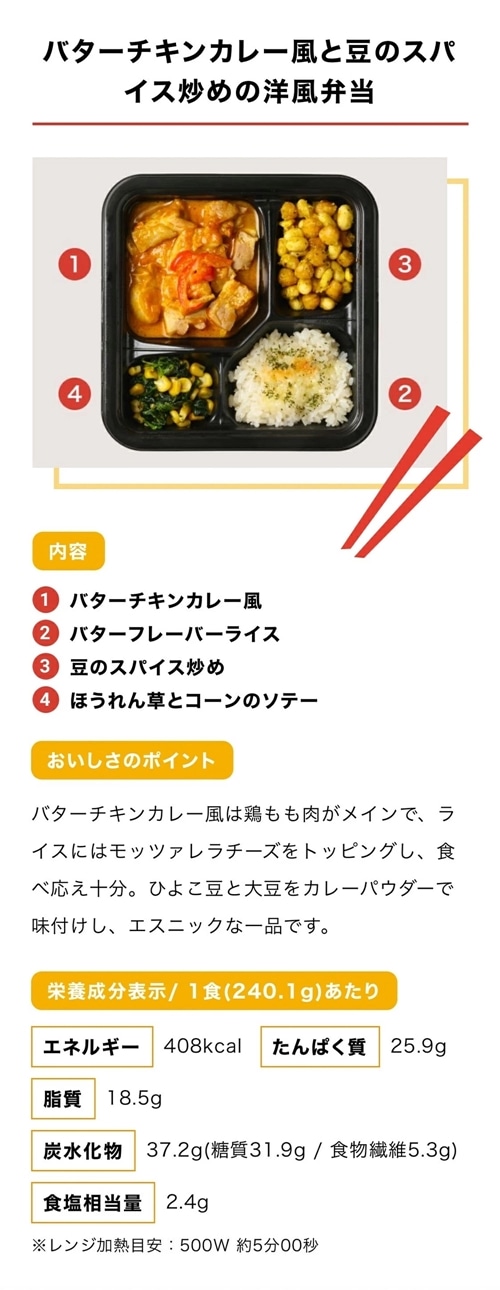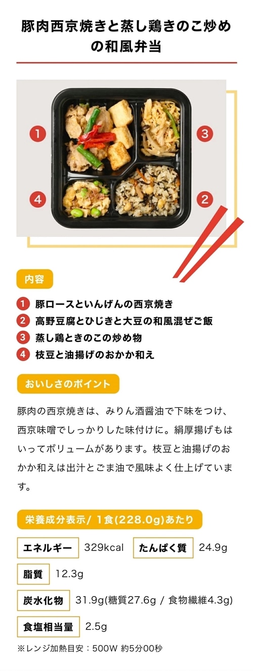 | 原材料名 | 【肉豆腐と枝豆入り玉子焼きの和風弁当】 牛肉煮[玉葱(国産)、牛肉、醤油、その他]、枝豆入り玉子焼き[液卵、枝豆、その他]、五目ご飯[白米(国産)、大豆、高野豆腐、和風だし、椎茸、醤油、その他]、豆腐煮(豆腐、醤油、その他)、だし醤油、和え物(油揚げ、高野豆腐、わかめ、和風だし、その他)、ほうれん草、人参/安定剤(加工澱粉)、凝固剤、加工澱粉、酢酸Na、酒精、膨張剤、pH調整剤、酸味料、紅麹色素、グリセリン脂肪酸エステル、(一部に卵・乳成分・小麦・えび・牛肉・ごま・さば・大豆・鶏肉・豚肉・ゼラチンを含む) 【豚肉西京焼きと蒸し鶏きのこ炒めの和風弁当】 豚肉西京焼[豚肉(カナダ産)、さやいんげん、みそ加工品、その他]、五目ご飯[白米(国産)、大豆、高野豆腐、和風だし、椎茸、醤油、その他]、蒸し鶏炒め物(味付蒸し鶏、小松菜、ぶなしめじ(国産)、植物油脂、その他)、厚揚げ、おかか和え(枝豆、油揚げ、和風だし、その他)、赤ピーマン、和風だし/糊料(加工澱粉)、凝固剤、酒精、膨張剤、pH調整剤、加工澱粉、酸味料、(一部に乳成分・小麦・ごま・さば・大豆・鶏肉・豚肉を含む) 【ミートドリア風とトマトチキンの洋風弁当】 枝豆入り玉子焼き(液卵、枝豆、その他)、ホワイトソース[牛乳(生乳(国産))、玉葱、その他]、バター風味ライス[白米(国産)、香味食用油、チキンコンソメ粉末、その他]、トマトチキン[鶏肉(ブラジル産)、トマト・ピューレーづけ、その他]、ミートソース、サラダ(ブロッコリー、マヨネーズ、落花生、チーズ)、チーズ、コーン、トマトケチャップ、胡椒/糊料(加工澱粉、増粘多糖類)、酢酸Na、加工澱粉、セルロース、乳化剤、pH調整剤、着色料(カラメル、カロチノイド)、香料、グリセリン脂肪酸エステル、酸化防止剤(V.E)、香辛料抽出物、(一部に卵・乳成分・小麦・落花生・牛肉・大豆・鶏肉・豚肉・ゼラチンを含む) 【バターチキンカレー風と豆のスパイス炒めの洋風弁当】 鶏肉塩こうじ焼[鶏肉(ブラジル産)、塩こうじ、その他]、スパイス炒め[ひよこ豆(アメリカ産)、大豆、その他]、バター風味ライス[白米(国産)、香味食用油、チキンコンソメ粉末、その他]、カレーソース(トマト・ピューレーづけ、玉葱、牛乳、乳等を主要原料とする食品、トマトソース、その他)、野菜炒め(ほうれん草、コーン、その他)、チーズ、赤パプリカ、パセリ/酢酸Na、糊料(加工澱粉、増粘多糖類、メタリン酸Na)、乳化剤、セルロース、pH調整剤、香料、グリセリン脂肪酸エステル、酸化防止剤(V.C)、着色料(カロチノイド)、(一部に乳成分・小麦・大豆・鶏肉・ゼラチンを含む) 【鶏肉カシューナッツと豚肉玉子炒めの中華風弁当】 鶏肉中華炒め[鶏肉(国産)、大豆、醤油、その他]、炒飯[白米(国産)、炒り卵、鶏肉、味付高菜、その他]、豚肉中華炒め[豚肉(カナダ産)、炒り卵、キャベツ、その他]、ラー油入り中華風和え物(小松菜、油揚げ、椎茸、その他)、ブロッコリー、カシューナッツ、赤ピーマン/加工澱粉、トレハロース、糊料(加工澱粉、増粘多糖類)、リン酸塩(Na)、凝固剤、グリシン、pH調整剤、酒精、着色料(カロチノイド、ウコン)、酸化防止剤(V.C、V.E)、(一部に卵・乳成分・小麦・カシューナッツ・ごま・さば・大豆・鶏肉・豚肉を含む) |