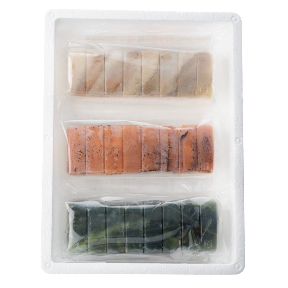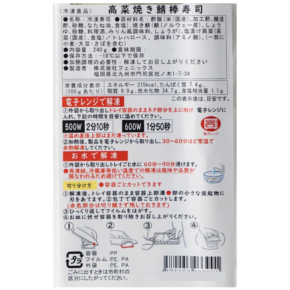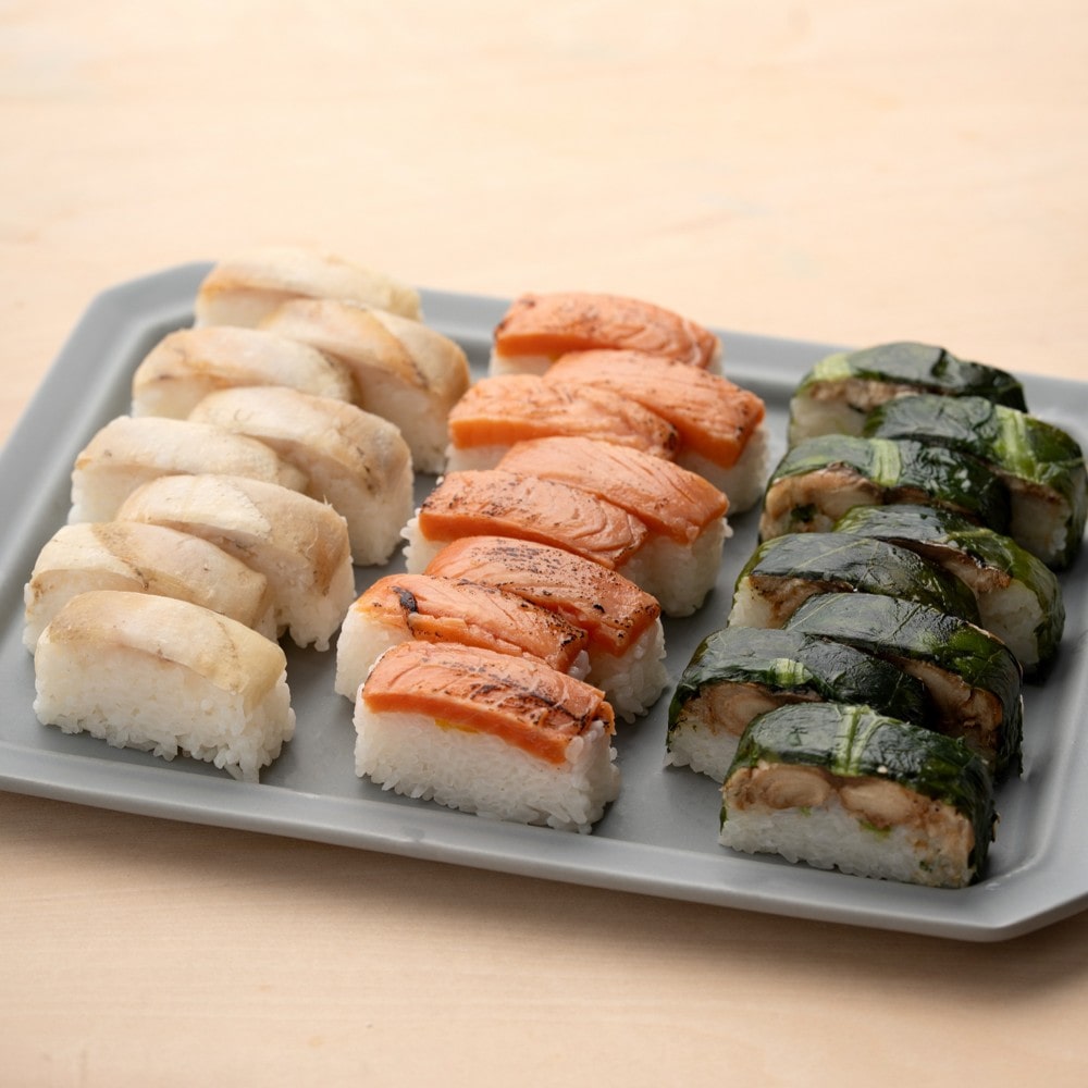 人気の高菜焼き鯖、炙りサーモン、のどぐろ棒寿司の3本食べ比べアソート