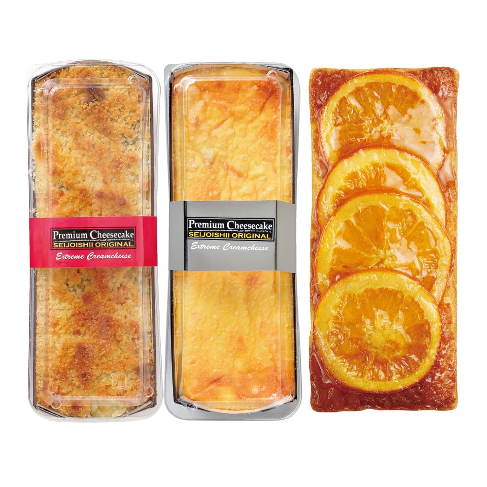 | 商品内容 | プレミアムチーズケーキ×1本/6種ナチュラルチーズの濃厚フォルマッジ×1本/オレンジケーキ×1本 |