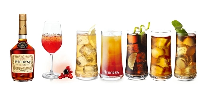 【オススメの飲み方:】氷で満たしたグラスにヘネシーV.Sとソフトドリンクを1:3で注ぎます。