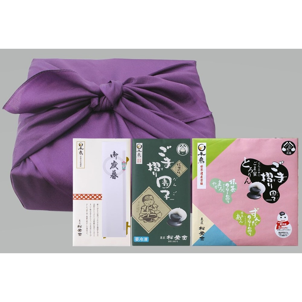 田むらの梅、ごま摺り団子をはじめとした人気商品をギフト用風呂敷で包みました。